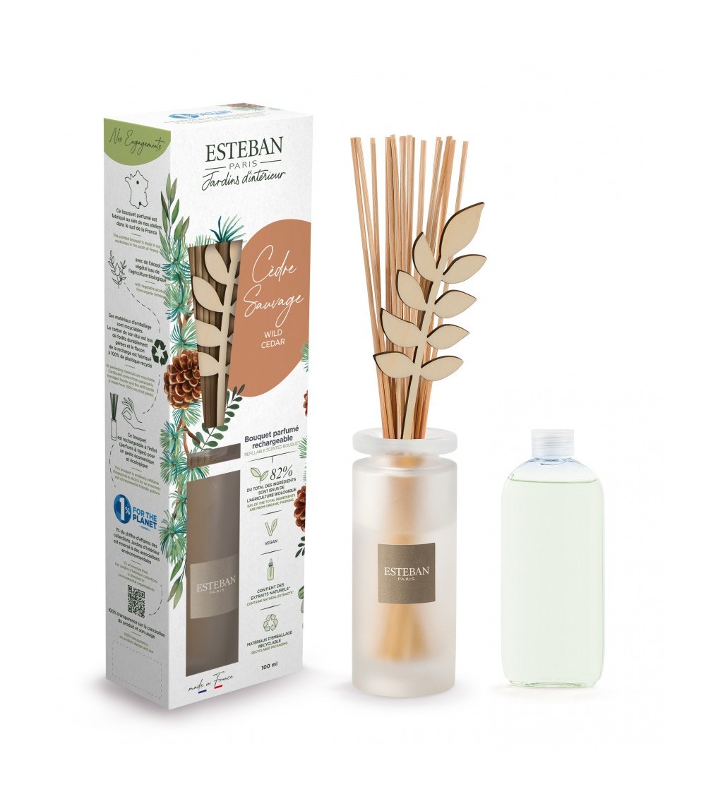 Diffusion permanente à froid pendant plusieurs semaines et rechargeable à l'infini grâce à la recharge pour bouquet.Contient- vase décoratif + solution parfumée 100 ml + tiges à parfums 26 cm + 1 tige décorative en bois Un parfum boisé frais Comme une escapade en forêtNotes de tête- Pin, cypresNote de cur- Bois de cèdreNotes de fond- ciste absolu, labdanum