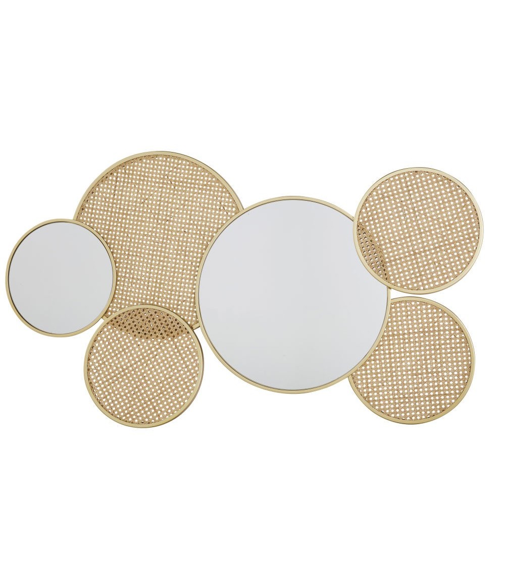 Le jeu de cercles superposés de la décoration murale JEAN va vous surprendre ! Mêlant rotin tressé et miroirs, les cercles finement soulignés de métal doré feront de cet accessoire de déco un point fort et tendance de votre intérieur !