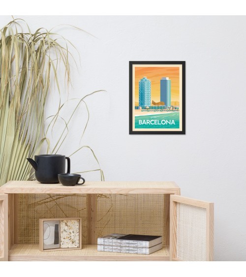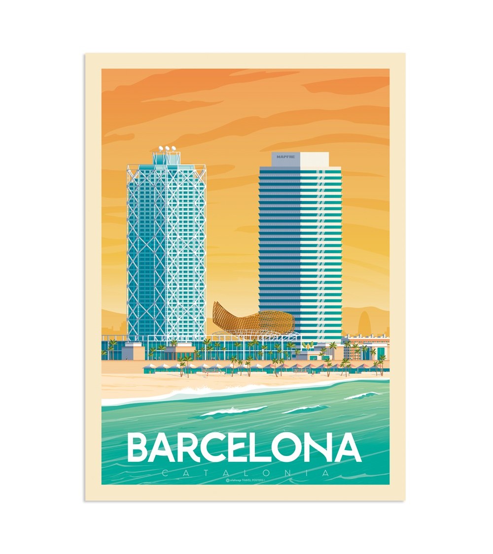 Une affiche de voyage au style vintage de la ville de Barcelone en Espagne. Ce poster au design rétro et coloré trouvera sa place dans la décoration intérieure de votre maison, dans une chambre denfant ou encore votre salon et salle de jeux. Produit illustré, imprimé et conditionné en France.