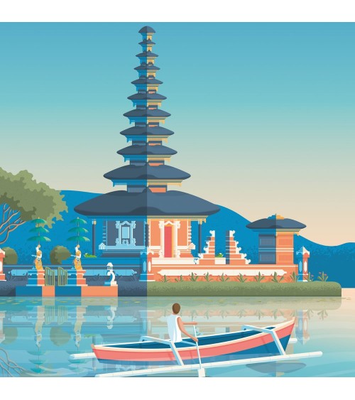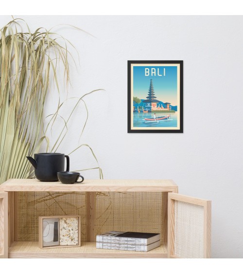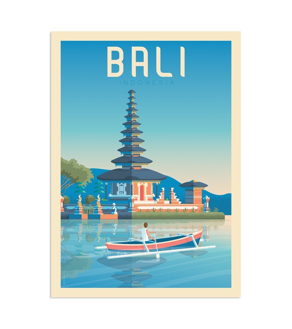 Une affiche de voyage au style vintage de Bali en Indonésie. Ce poster au design rétro et coloré trouvera sa place dans la décoration intérieure de votre maison, dans une chambre denfant ou encore votre salon et salle de jeux. Produit illustré, imprimé et conditionné en France.