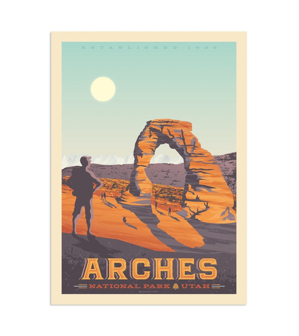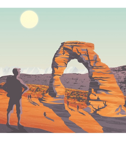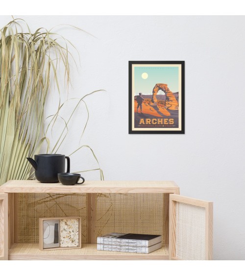 Une affiche de voyage au style vintage du Parc National Arches dans l'Utah aux Etats.Unis. Ce poster au design rétro et coloré trouvera sa place dans la décoration intérieure de votre maison, dans une chambre denfant ou encore votre salon et salle de jeux. Produit illustré, imprimé et conditionné en France.