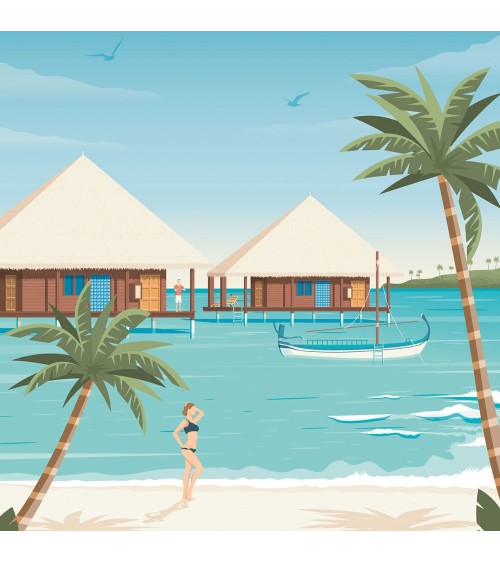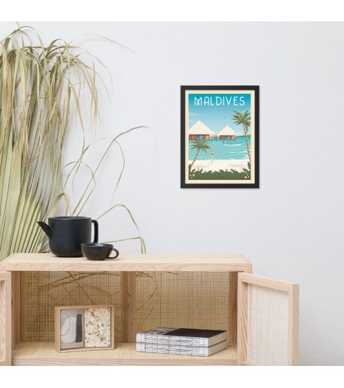 Une affiche de voyage au style vintage des Iles Maldives. Ce poster au design rétro et coloré trouvera sa place dans la décoration intérieure de votre maison, dans une chambre denfant ou encore votre salon et salle de jeux. Produit illustré, imprimé et conditionné en France.