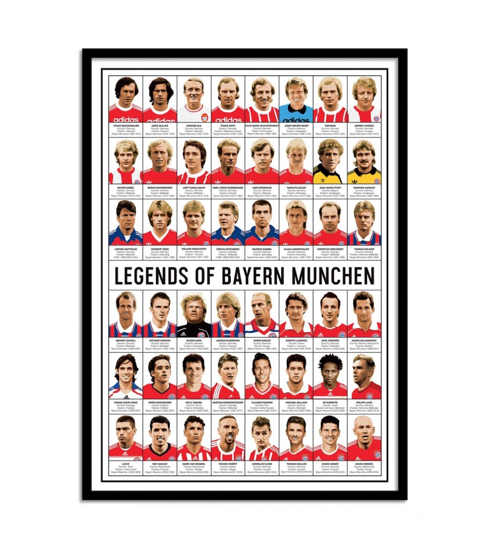 LES AFFICHES - Nos affiches sont imprimées en France, ou Union Européenne.Papier issu de forêts certifiées FSC.Affiche imprimée sur papier couché mat 250g, Haute Définition.Pour les formats d'affiches 30x40 cm - contient des marges blanches de 1,5 cm.Pour les formats d'affiches 50x70 cm - contient des marges blanches de 2 cm.OPTION CADRES - Nos cadres en bois sont fabriqués en France.Comprend une vitre en verre acrylique.Dimensions des cadres en bois 30x40 cm - Epaisseur du cadre - 15 mm, Profondeur du cadre - 20 mmDimensions des cadres en bois 50x70 cm - Epaisseur du cadre - 15 mm. Profondeur du cadre - 20 mm. Découvrez cette mozaïque de 48 footballeurs mythiques du Bayern Munich sur une seule affiche. Olivier Bourdereau expose ces joueurs cultes comme Beckenbauer, Muller, Matthaus, Oliver Kahn, Philippe Lahm et bien d'autres, dans une composition de type encyclopédique où l'on retrouve les informations importantes de nos athletes préférés. Convient parfaitement à tous les fans de Foot !