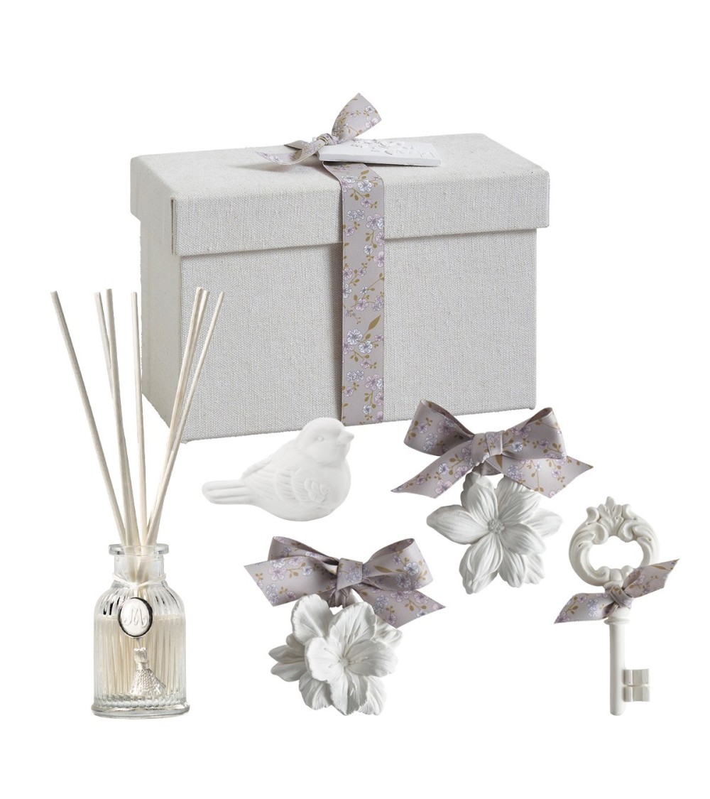 Pour offrir ou vous faire plaisir, découvrez le coffret de parfum d'ambiance Les présents de Mathilde et son irrésistible parfum Sublime Jasmin, une senteur intense et addictive mêlant avec finesse les notes éclatantes du jasmin et de la fleur d'oranger sur un tendre nuage de vanille et muscs blancs.Ce coffret contient -. Un diffuseur de parfum d'ambiance 30 ml, parfum Sublime Jasmin. 4 décors en plâtre parfumée, parfum Sublime JasminInformations complémentaires -Dimensions boîte - 17,3 x 11,5 x 7,8 cm