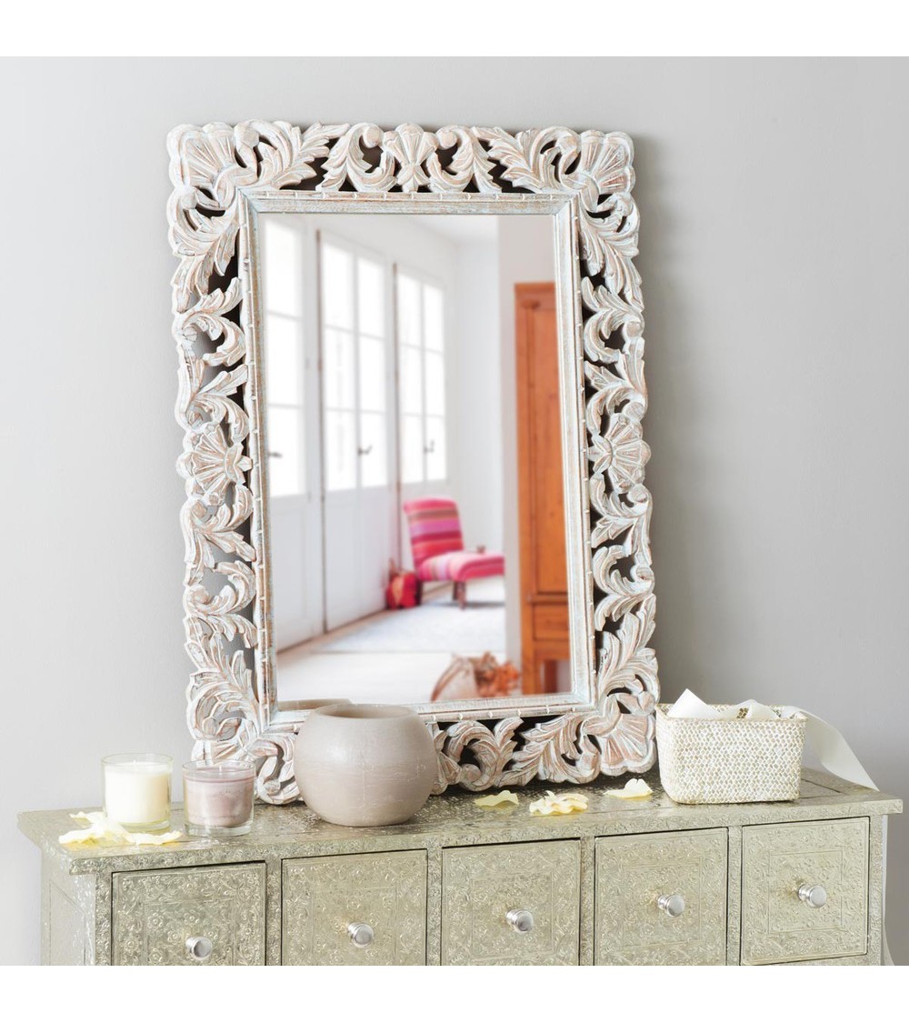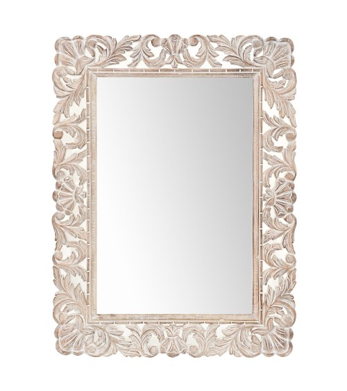 Souligné par un cadre entièrement sculpté, ce miroir en manguier blanchi 60x80 KYARA apportera un charme exotique à votre intérieur. Simplement posé au sol ou bien fixé au mur, ce miroir indien donnera de l'ampleur à votre pièce. Travaillé avec un effet légèrement blanchi, il complètera à merveille une ambiance ethnique à la fois douce et raffinée.