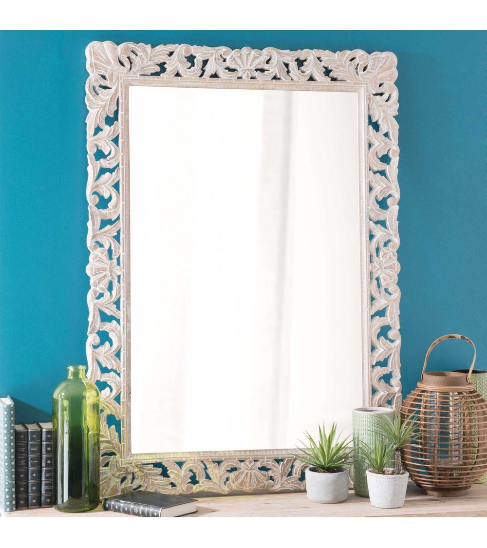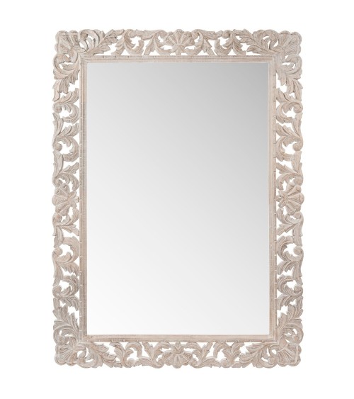 Les motifs sculptés n'ont pas fini de vous étonner avec le miroir en manguier blanchi 79x110 KYARA. Son encadrement aux sculptures végétales s'associe à un coloris blanchi qui se veut intemporel et capable de s'introduire dans tous les styles de déco. Exotique chic ou romantique, le look de ce miroir s'adaptera à vos tendances préférées. Posé à l'horizontale, à la verticale, ou accroché au mur, les possibilités sont multiples pour exposer ce miroir.