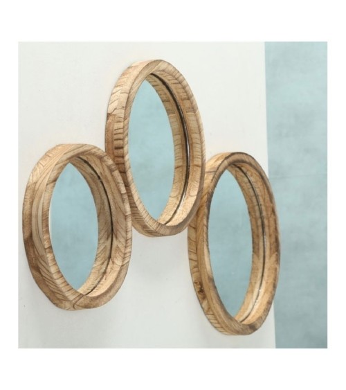 Set de 3 miroirs ronds en bois de palownia. Des miroirs de différentes tailles à disposer côte à côte pour un rendu déco élégant et chaleureux. Dimensions- Diamètre 25/30/35cm . Couleur- Bois . Matière- Bois et Verre