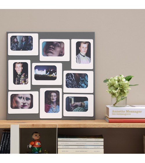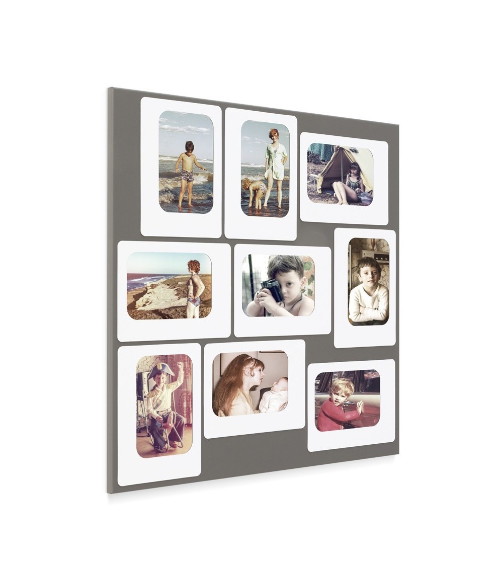 Accroché au mur, le pèle mêle cadre photos magnétique M9 en tole laquée fait son petit effet. Les photos se disposent au sein du tableau comme vous le souhaitez et se fixent en utilisant les cadres de caoutchouc qui se magnétisent au tableau : c'est pratique et esthétique ! Dimensions : 45 x 45 x 1cm - Matière : Tôle laquée et caoutchouc magnétique