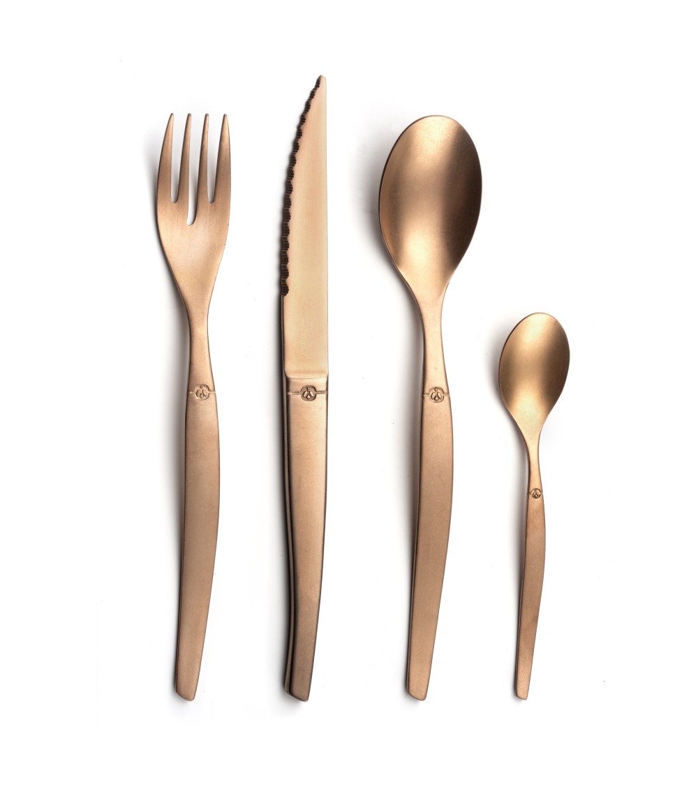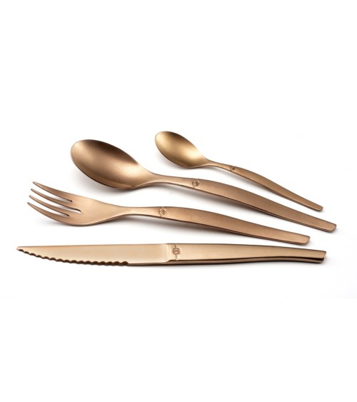 Ensemble de 16 couverts Laguiole pour 4 personnes de la gamme Jet. Couverts en acier inox avec revêtement cuivre mat. Lame micro-dentée pour une coupe optimale et un tranchant longue duréeLe Jet est laguiole de table au design contemporain, souligné par un poinçon d'abeille moderne et stylisé. Le Jet se décline ici dans une teinte cuivrée éclatante qui en fait le laguiole le plus stylé de sa génération.Lou Laguiole® allie la force de la Tradition et l'élégance de la Modernité. Notre gamme de couteaux Laguiole est la garantie d'une signature raffinée pour des tables authentiques au quotidien. Entretien : Lavage manuel recommandé, avec une éponge non abrasive