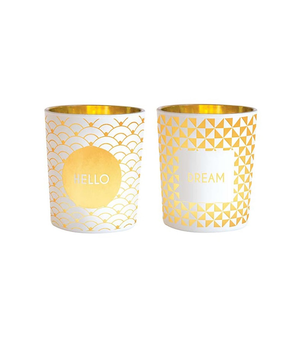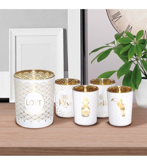 Craquez pour ce lot de mini photophores en verre blanc et or. Ils apporteront une petite touche originale à votre intérieur. Avec une bougie, une petite plante ou même vide, ces photophores sont de véritables objet déco ! Ils ont un diamètre de 6,5 cm et une hauteur de 4,5cm. Vendus sans bougie.