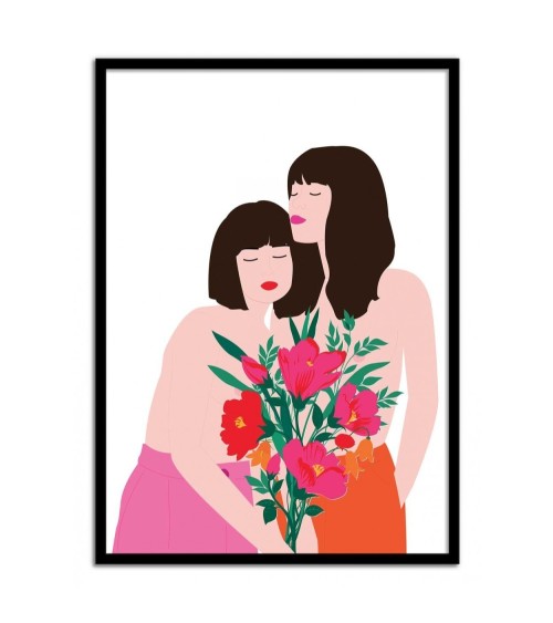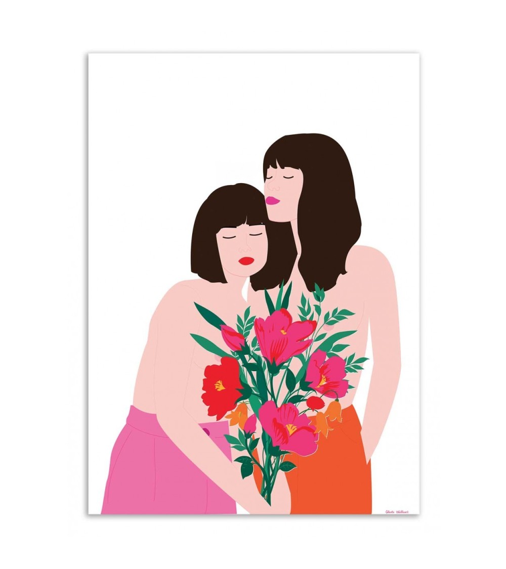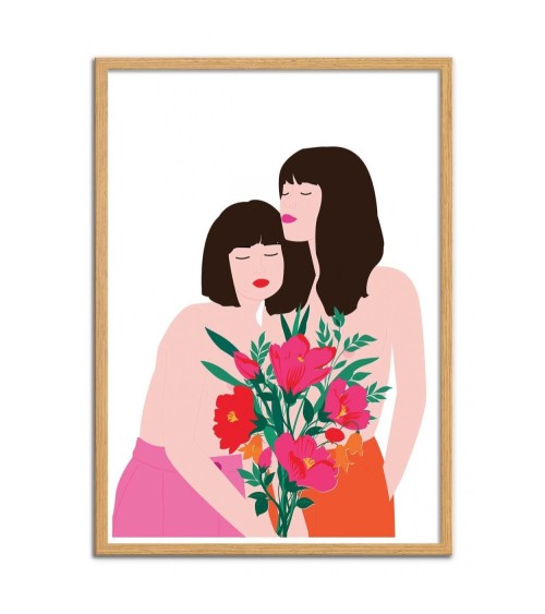 LES AFFICHES : Nos affiches sont imprimées en France, ou Union Européenne.Papier issu de forêts certifiées FSC.Affiche imprimée sur papier couché mat 250g, Haute Définition.Pour les formats d'affiches 30x40 cm : contient des marges blanches de 1,5 cm.Pour les formats d'affiches 50x70 cm : contient des marges blanches de 2 cm.OPTION CADRES : Nos cadres en bois sont fabriqués en France.Comprend une vitre en verre acrylique.Dimensions des cadres en bois 30x40 cm : Epaisseur du cadre : 15 mm, Profondeur du cadre : 20 mmDimensions des cadres en bois 50x70 cm : Epaisseur du cadre : 15 mm. Profondeur du cadre : 20 mm. L'artiste Céleste Wallaert milite pour le droit des femmes et contribue à travers son art à changer les mentalités et montrer à quel point le féminisme est beau ! Sur ce poster nous pouvons voir deux filles, deux amies, deux surs à moitié nues tenant un sublime bouquet de fleur. Tout y est amour et harmonie ! Cette décoration murale est un hommage à la sororité.