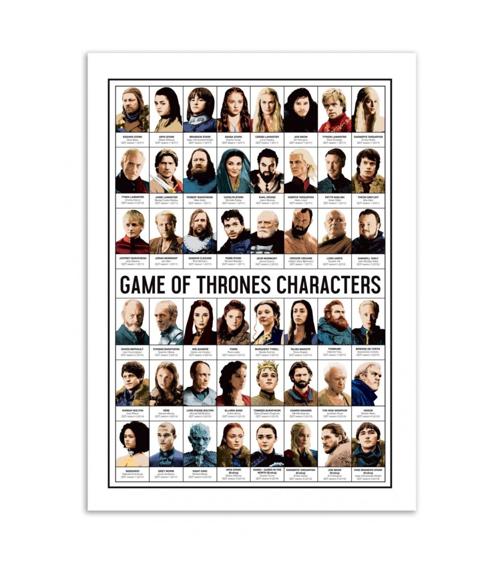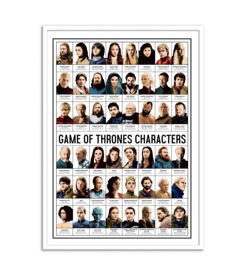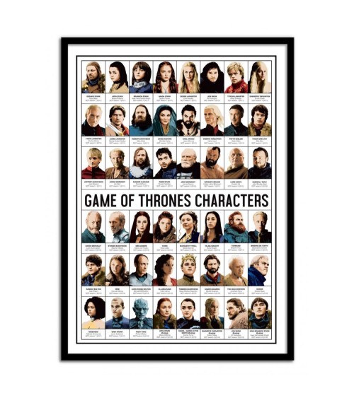 LES AFFICHES : Nos affiches sont imprimées en France, ou Union Européenne.Papier issu de forêts certifiées FSC.Affiche imprimée sur papier couché mat 250g, Haute Définition.Pour les formats d'affiches 30x40 cm : contient des marges blanches de 1,5 cm.Pour les formats d'affiches 50x70 cm : contient des marges blanches de 2 cm.OPTION CADRES : Nos cadres en bois sont fabriqués en France.Comprend une vitre en verre acrylique.Dimensions des cadres en bois 30x40 cm : Epaisseur du cadre : 15 mm, Profondeur du cadre : 20 mmDimensions des cadres en bois 50x70 cm : Epaisseur du cadre : 15 mm. Profondeur du cadre : 20 mm. Découvrez une mozaïque de 48 personnages sur une seule affiche, inspirée de la série Game of Thrones. Olivier Bourdereau expose ces personnages cultes comme Jon Snow, la famille stark, Lannister, Daenerys et bien d'autres, dans une composition de type encyclopédique où l'on retrouve les informations importantes de nos personnages préférés. Convient parfaitement à tous les fans de cinéma !