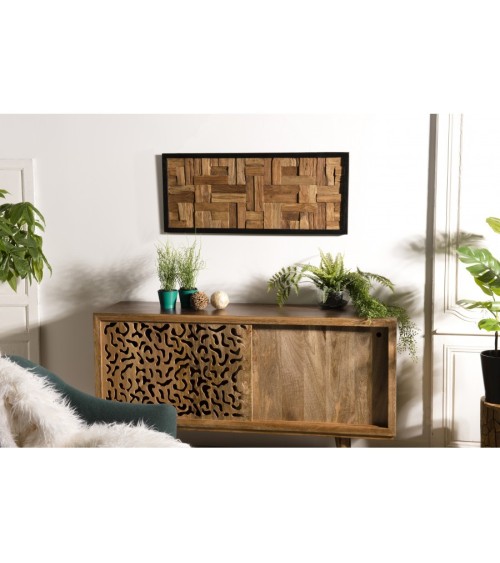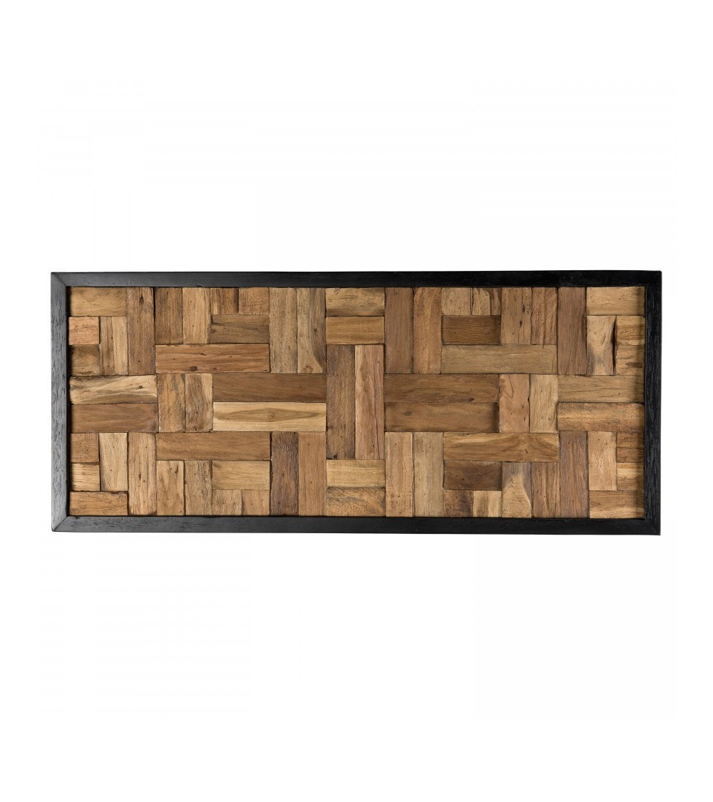Décoration murale rectangulaire mosaïque Teck recyclé nature. Dimensions : 106 x 46 x 4 cm. Article en Teck recyclé. Cet article est composé de bois recyclé ! Le bois recyclé est un bois récupéré de vieilles charpentes, de coques de bateaux ou tout bois de récupération ayant déjà eu une longue vie. C'est ce qui lui donne cet aspect vieilli et authentique avec ses imperfections qui font tout son charme.   Acquérir du bois recyclé est une initiative écoresponsable qui permet de lutter contre la déforestation.