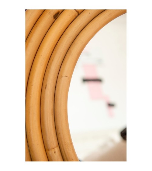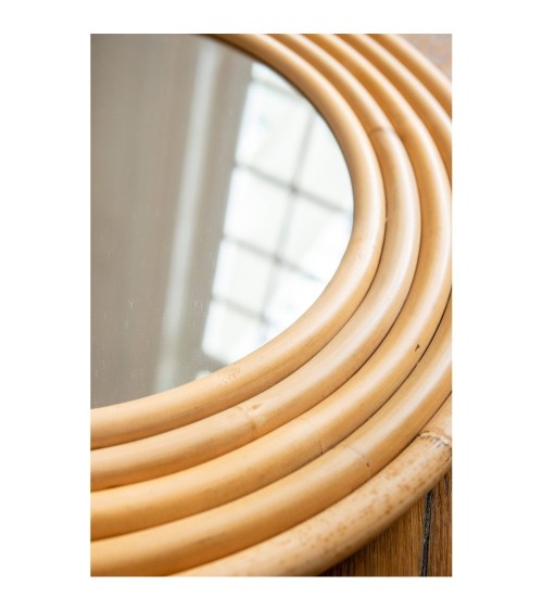 Inspirée des lignes du rotin des années 70-80 la collection Riviera en en reprend les codes graphiques caractéristiques: du rotin de gros diamètre, des formes simples et épurées, du robuste et du costaud. Mais ici, pas de couleurs vives comme à l'époque. Nous avons préféré un traitement ''au naturel'' qui la rend finalement très actuelle: le rotin est semi-écorcé, pour laisser les noeuds partiellement visibles, une légère coloration ambrée pour uniformiser l'ensemble et un vernis satiné transparent. Dimensions hors tout: diamètre 70cm x épaisseur 3 cm . Poids 4 kg. Structure en rotin naturel semi-écorcé, teinté, vernis cellulosique. Miroir verre épaisseur 3 mm sur fond contreplaqué. Fabrication Indonésie. Livré monté.