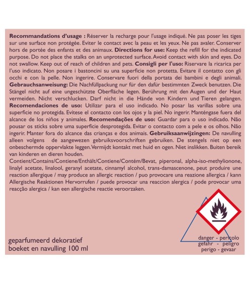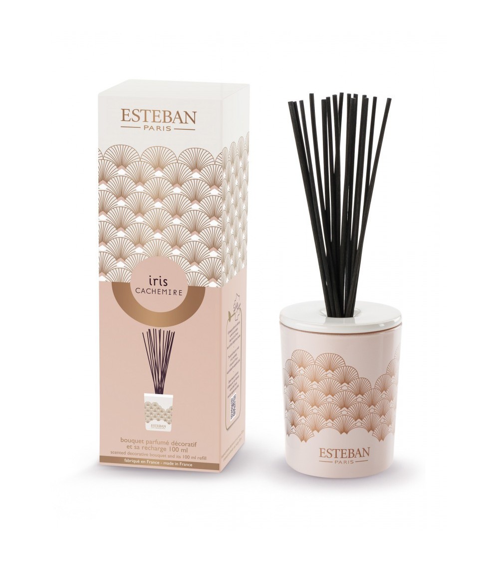 Diffusion permanente à froid pendant plusieurs semaines et rechargeable à l'infini grâce à la recharge pour bouquet.Contient: vase décoratif + capot en céramique + solution parfumée 100 ml + tiges à parfums 22 cmUn parfum floral poudréNote de tête : mandarine, feuilles de violetteNote de cur : absolue d'iris, pétales de rose, abricotNote de fond : bois de cachemire, musc végétal, fève tonka