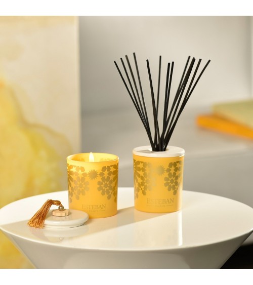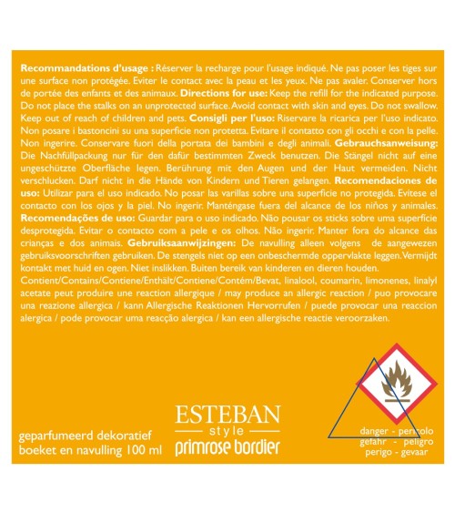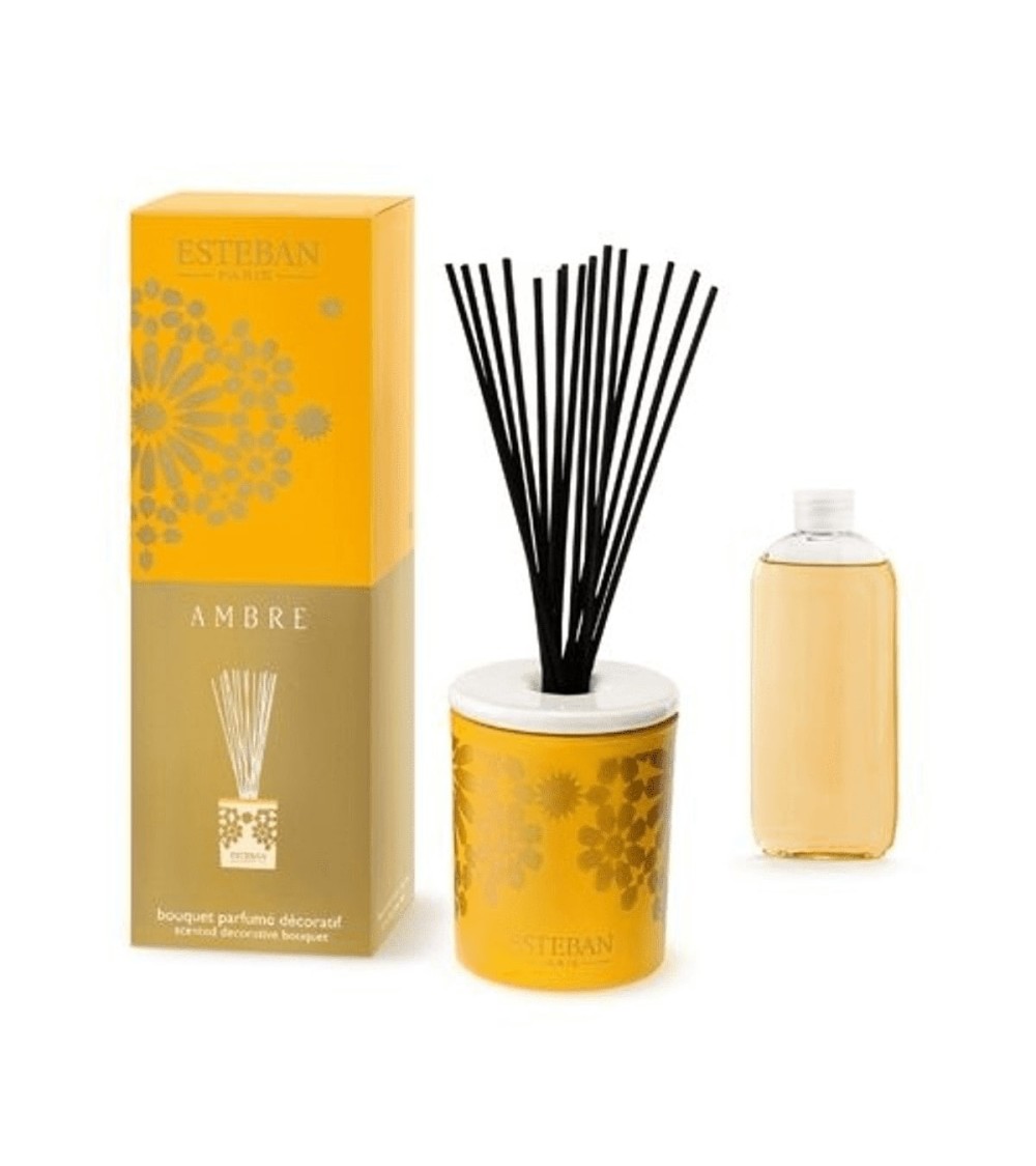 Ce bouquet décoratif aux motifs ornés de touches d'or vous emmène en voyage en Orient. Son envoutant parfum Ambre invite au partage et à la convialité, faisant de votre intérieur un lieu où l'on se plait à s'y attarder.Diffusion permanente à froid pendant plusieurs semaines et rechargeable à l'infini grâce à la recharge pour bouquet Ambre.Contient: vase décoratif + capot en céramique + solution parfumée 100 ml + tiges à parfums 22 cmUn parfum ambré hespéridéNotes de tête: bergamote, citronNote de cur: patchouli, santalNotes de fond: ambre, vanille