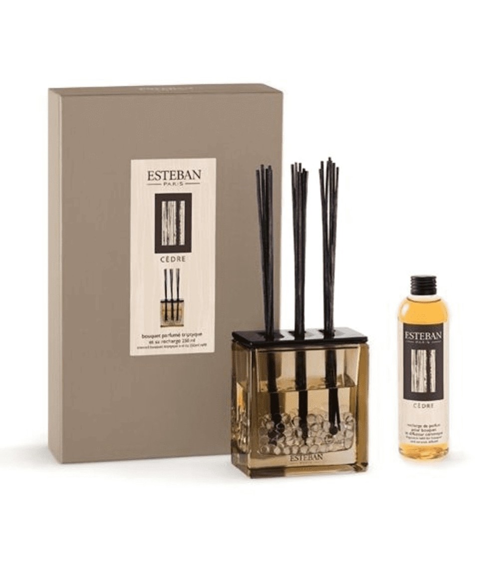 Diffusion permanente à froid pendant plusieurs semaines et rechargeable à l'infini grâce à la recharge pour bouquet.Contient: vase décoratif + solution parfumée 250 ml + tiges à parfums 22 cm Un parfum boisé frais une échappée vers des contrées où la nature respire, sauvage et majestueuse.Notes de tête : pamplemousse, muscadeNotes de cur : cèdre, girofle, patchouliNotes de fond : santal, baume, vanille