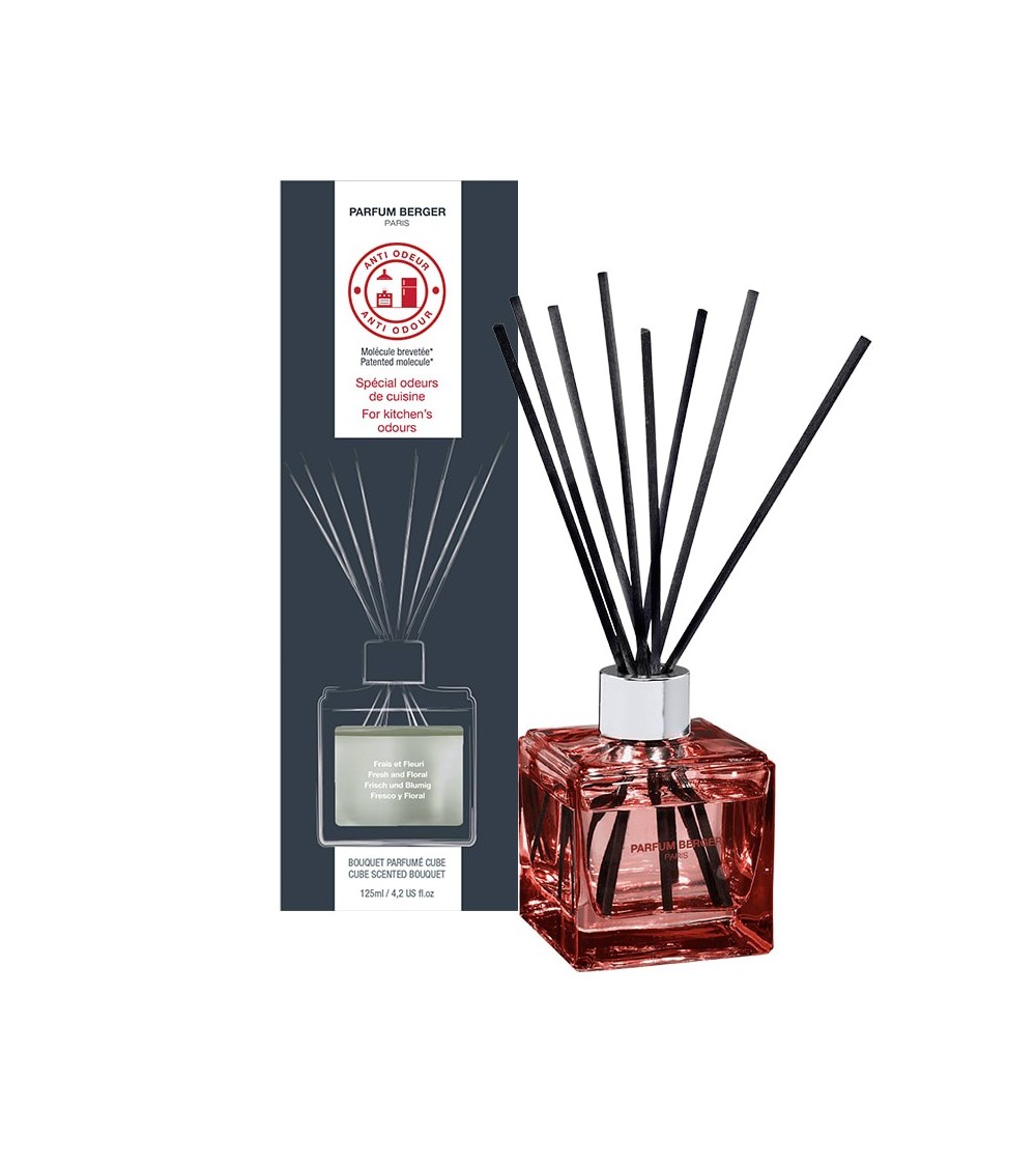 Une exclusivité Parfum Berger pour ce bouquet parfumé. Le complexe breveté de molécules contenu dans ce bouquet parfumé neutralise de façon ciblée les mauvaises odeurs de cuisine (odeurs de poisson, d'ammoniaque, d'ail, d'oignon...). Élégant et contemporain, ce cube en verre laqué rouge épicé et sérigraphié du logo Parfum Berger apportera une touche de dynamisme dans votre cuisine. Son parfum frais et fleuri dans lequel se mêle basilic, freesia et bois précieux neutralisera parfaitement les odeurs de nourriture désagréable. Hauteur : 21 cm