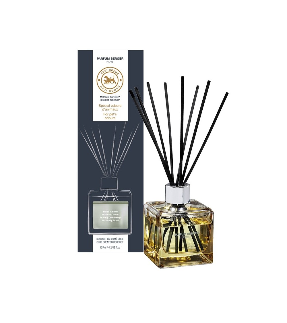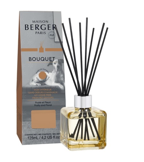 Ce bouquet parfumé inédit neutralise les mauvaises odeurs de nos amis à quatre pattes grâce à sa molécule brevetée. Son joli flacon translucide couleur champagne sérigraphié est rehaussé par une bague argentée et son bouquet de brins noirs. Les brins, en polymère technique, s'imprègnent par capillarité pour une diffusion continue du parfum pendant environ 5 semaines, sans décoloration dans la solution. Pré-rempli avec 125 ml de parfum fruité et fleuri qui renforce l'action de la molécule neutralisante.Hauteur : 21 cm
