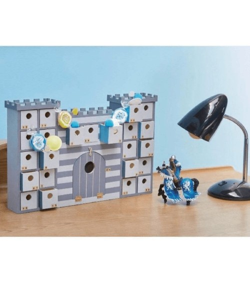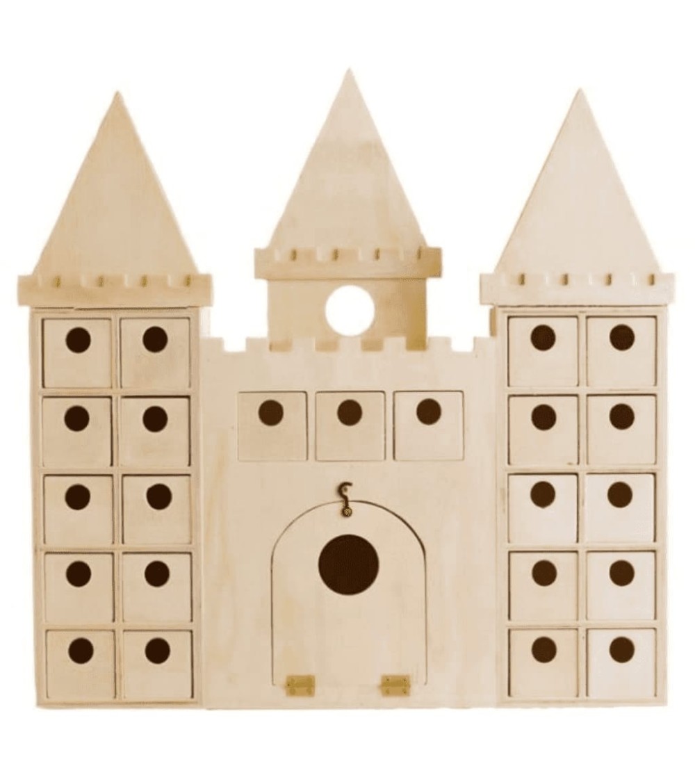 Calendrier de l'Avent en bois représentant un château-fort mesurant 42,3 x 6 x 42 cm, à personnaliser et à décorer! Il est composé de 23 tiroirs et une porte à remplir de chocolats, bonbons et autres surprises pour patienter jusqu'à Noël ! Il est possible de réaliser 2 versions du château: en effet, 3 triangles en bois sont fournis pour transformer le château-fort en château de princesse. Dimensions des 3 triangles: 2 triangles simples mesurant 12,5 x 12,5 cm et le triangle central monté sur une tourelle mesurant 21 x 12,5 cm. Parfait support pour créer un calendrier de l'Avent pour vos enfants. Personnalisez la structure de votre château avec de la peinture, un collage, du papier Artepatch ou toute autre technique à votre convenance. Après les fêtes, il pourra ensuite être recyclé en meuble de rangement pour vos affaires de couture ou de scrapbooking.