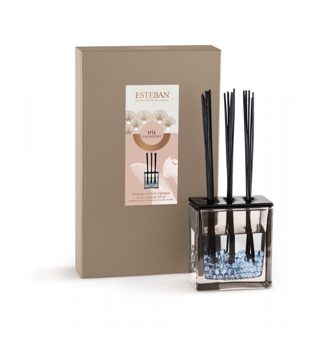 Diffusion permanente à froid pendant plusieurs semaines et rechargeable à l'infini grâce à la recharge pour bouquet.Contient: vase décoratif + solution parfumée 250 ml + tiges à parfums 22 cmUn parfum floral poudréNote de tête : mandarine, feuilles de violetteNote de cur : absolue d'iris, pétales de rose, abricotNote de fond : bois de cachemire, musc végétal, fève tonka