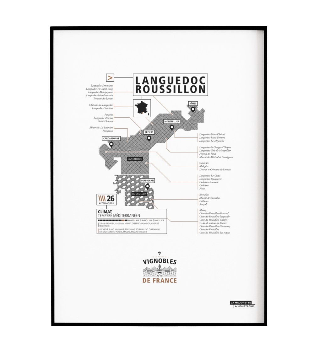 Une affiche graphique et minimaliste, qui illustre les vignobles du Languedoc-Roussillon avec ses terres de caractères et son climat ensoleillé. * Format 30 X 40 cm* Imprimée sur du papier mat 200g haute qualité* Expédiée seule (compatible avec encadrement standard)* 100% Made in FranceLa Majorette à Moustache, c'est une collection d'affiches et de cartes postales dédiées à la culture française.Éducatifs, graphiques et humoristiques, nos produits revisitent de nombreux thèmes pour (re)découvrir notre beau pays: foot, vignobles, architecture, ou encore les icones mythiques de la chanson française.Avec ses valeurs, La Majorette décline une gamme haute en couleur, richement illustrée et au design graphique soigné. N'hésitez plus, affichez sur vos murs votre amour de la Pop Culture FR !