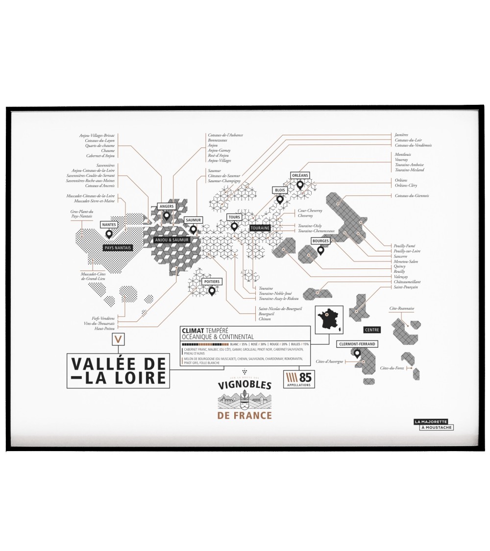 Une affiche graphique et minimaliste, qui illustre les vignobles de la Vallée de la Loire avec ses terres et ses vins aux divers typicités. * Format 30 X 40 cm* Imprimée sur du papier mat 200g haute qualité* Expédiée seule (compatible avec encadrement standard)* 100% Made in FranceLa Majorette à Moustache, c'est une collection d'affiches et de cartes postales dédiées à la culture française.Éducatifs, graphiques et humoristiques, nos produits revisitent de nombreux thèmes pour (re)découvrir notre beau pays: foot, vignobles, architecture, ou encore les icones mythiques de la chanson française.Avec ses valeurs, La Majorette décline une gamme haute en couleur, richement illustrée et au design graphique soigné. N'hésitez plus, affichez sur vos murs votre amour de la Pop Culture FR !