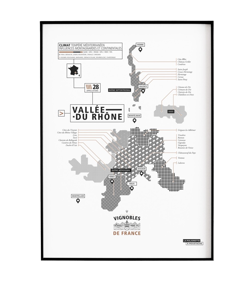 Une affiche graphique et minimaliste, qui illustre les vignobles de la Vallée du Rhône avec ses terres d'exception : de l'A.O.C Ventoux aux Costières de Nîmes en passant par la Drôme provençale. * Format 30 X 40 cm* Imprimée sur du papier mat 200g haute qualité* Expédiée seule (compatible avec encadrement standard)* 100% Made in FranceLa Majorette à Moustache, c'est une collection d'affiches et de cartes postales dédiées à la culture française.Éducatifs, graphiques et humoristiques, nos produits revisitent de nombreux thèmes pour (re)découvrir notre beau pays: foot, vignobles, architecture, ou encore les icones mythiques de la chanson française.Avec ses valeurs, La Majorette décline une gamme haute en couleur, richement illustrée et au design graphique soigné. N'hésitez plus, affichez sur vos murs votre amour de la Pop Culture FR !