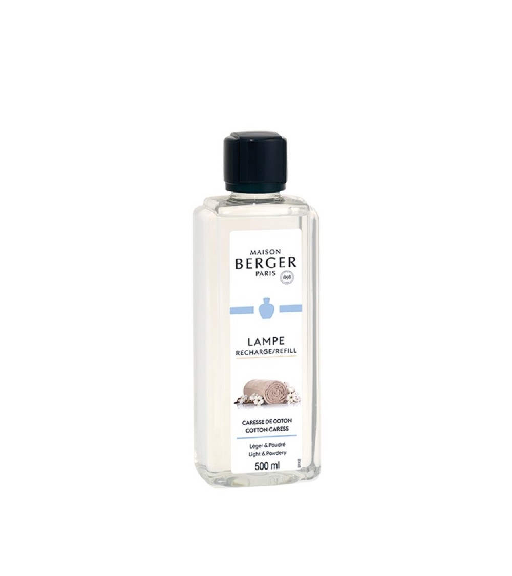 Rechargez votre Lampe Berger avec cette recharge pour lampe Berger Caresse de Coton 500ml pour une ambiance chaleureuse, purifiée et parfumée. Ce parfum d'ambiance pour Lampe Berger existe aussi en format 1L pour prolonger vos moments de quiétude et de bien-être. Le parfum Caresse de Coton de Maison Berger Paris vous enveloppe complètement.Gestuelle :Depuis 1898, la Lampe Berger est entrée dans le quotidien des français. Destinée au départ à purifier l'air en neutralisant les odeurs, elle fut transformée en objet décoratif et parfumant dans l'entre-deux-guerres, investissant progressivement la sphère privée. Sa double action est aujourd'hui très appréciée.Parfum :Élaborés par les maîtres-parfumeurs grassois en collaboration avec le service recherche et développement de la marque, chaque parfum Maison Berger Paris est unique. Une large offre de fragrances est disponible.L'exigence est à son plus haut niveau concernant la qualité des produits proposés, les substances diffusées sont régulièrement contrôlées par des laboratoires indépendants. C'est la garantie pour vous de l'absence de fumées et de polluants dans l'air.Conseils d'utilisation :Le brûleur pour Lampe Berger doit être changé tous les 200 allumages ou tous les ans.Adaptez l'intensité de votre parfum en le diluant avec le parfum de maison Air Pur.Mentions légales :Isopropanol. Liquide et vapeurs très inflammables. Provoque une sévère irritation des yeux. Peut provoquer somnolence ou vertiges. Dangereux. Respecter les précautions d'emploi.