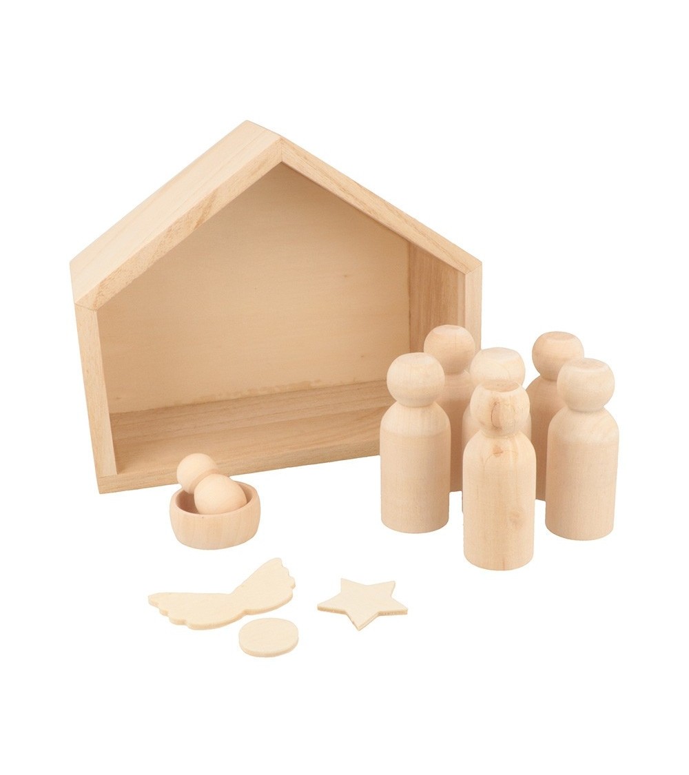 Crèche en bois Fêtez Noël grâce à cette magnifique crèche en bois à décorer ! La crèche Artemio est en bois naturel non verni FSC et mesure 18x8x15 cm. Elle est livrée avec 7 pions en bois représentant les 3 rois mages, Jésus, Marie, Joseph, 1 ange ainsi que 4 pièces décoratives étant le berceau, les ailes d'ange, l'étoile et l'auréole. A décorer en fonction de vos goûts et de vos envies, avec peinture, pochoirs, masking tapes, stickers.