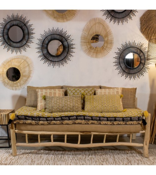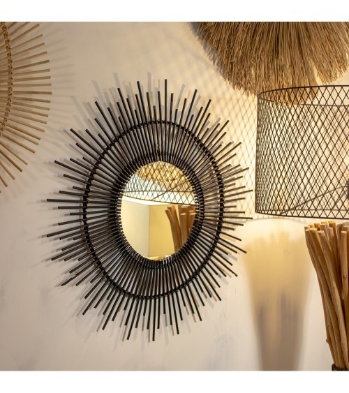 Après le rotin, le bois et le métal, c'est au tour du bambou de revisiter l'emblématique miroir soleil ! Grâce à ses branchages à peine taillés, le miroir rond en bambou INCA signe le retour de la déco bord de mer plus naturelle et authentique que jamais. On parie que son charme brut et dépaysant va faire tourner les têtes ! Miroir Bambou INCA. Matériau: bambou. Couleur: Noir. Dimension: Ø61 CM Nettoyer à l'aide d'un chiffon sec