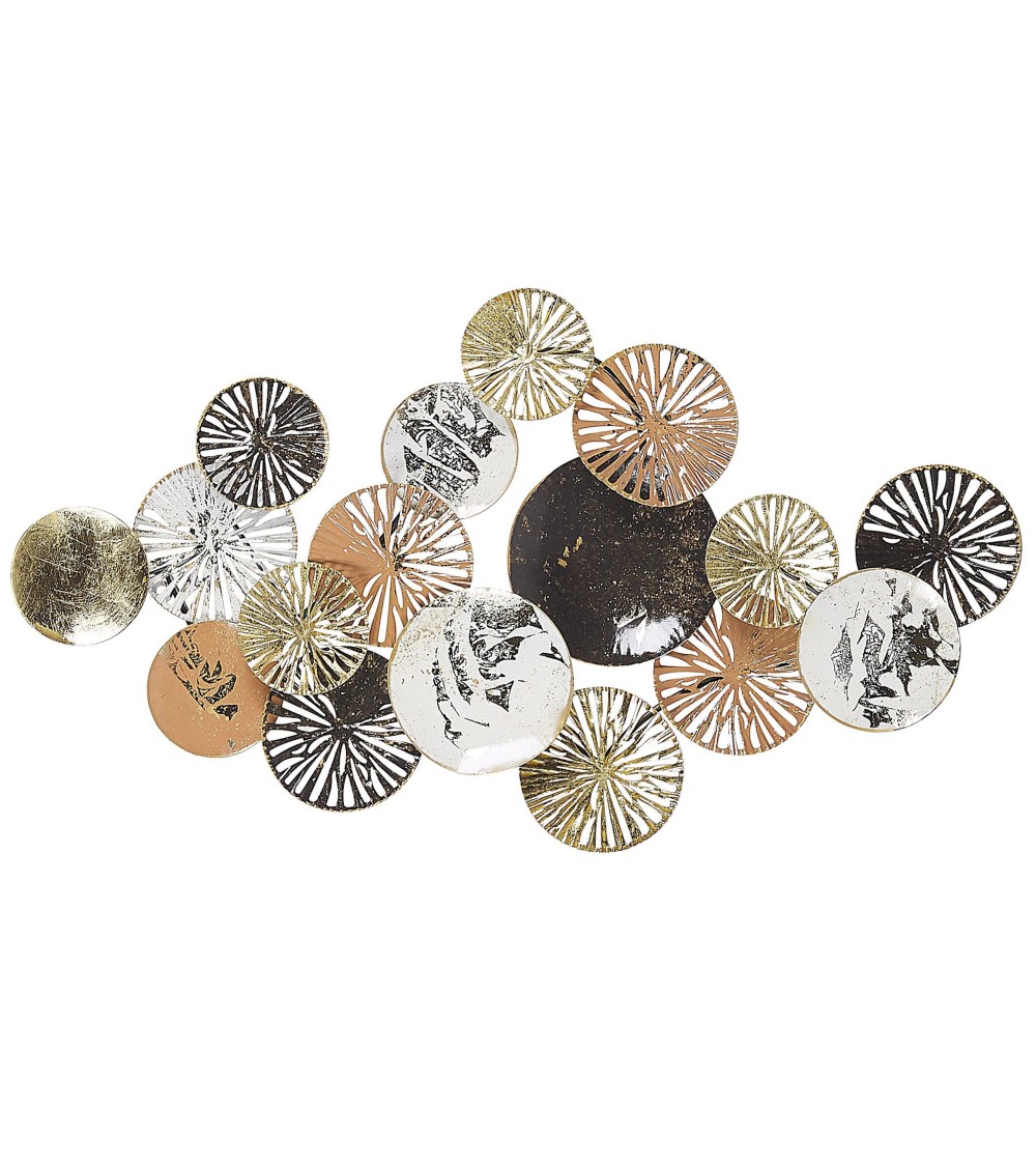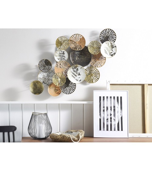 Décoration murale en métal en forme de cercles. Fabriquée à partir de cercles d'or, de cuivre et de blanc, cette décoration murale ajoute une ambiance industrielle à chaque aménagement. Fabriqué à partir de métal durable, avec un cadre ouvert, il laisse passer les rayons du soleil et crée un effet d'éclairage unique sur le mur. Avec la finition légèrement vieillie, cette décoration murale s'intègre à la fois dans les intérieurs modernes et rétro.Détails: Type de produit: Décoration murale Style: Moderne Couleur principale: Doré Type de matière: Métal Matière principale: Métal Fabriqué à la main: Oui Dimensions: Profondeur: 6 cm Largeur: 91 cm Hauteur: 50 cm Poids: 3 kg L`offre inclue: 1 x Décoration murale Caractéristiques clés: Meuble attrayant pour l'intérieur, Design moderne, Facile à entretenir et extrêmement durable, Résistance exceptionnelle, Finition précise Informations d`assemblage: Ne nécessite pas d'assemblage Informations supplémentaires: Chaque produit de ce modèle est fait à la main et donc unique, la nuance et le motif peuvent être légèrement différents du modèle présenté sur l'image. Conseils de maintenance: Métal: 1.Pour éviter les rayures, n'utilisez pas de nettoyants abrasifs 2. Nettoyez avec un chiffon et un détergent doux, essuyez bien ensuite 3.Pour les éléments en cuivre ou chromés, utilisez un produit de polissage spécial.