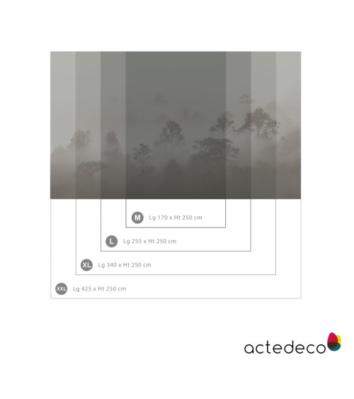 Une légère brume matinale envahie votre intérieur dans un ambiance cosy. Une pure sensation de calme et de sérénité ! Papier peint Intissé Lessivable Lisse Mat 160g sans PVC à encoller - Encres Latex sans solvant et sans COV - Classement au feu M1 - Fabrication Française.4 tailles au choix : - M : Lg 170 x Ht 250 cm en 2 lés de 85 cm- L : Lg 255 x Ht 250 cm en 3 lés de 85 cm- XL : Lg 340 x Ht 250 cm en 4 lés de 85 cm- XXL : Lg 425 x Ht 250 cm en 5 lés de 85 cm. Recouvrement de 2 cm entre chaque lé pour double coupe.Intissé à base de fibres cellulosiques et polyester liées par un acrylique sans PVC 160g. Impression encres Latex sans solvant et sans COV. Classement au feu M1.Aspect mat lisse (calandré). Très bon rendu des couleurs. Très bonne stabilité dimensionnelle. Cache les petites imperfections du mur, la préparation du mur est simplifiée. Bonne résistance à la déchirure lors de la pose.