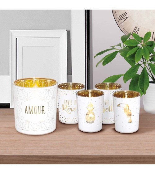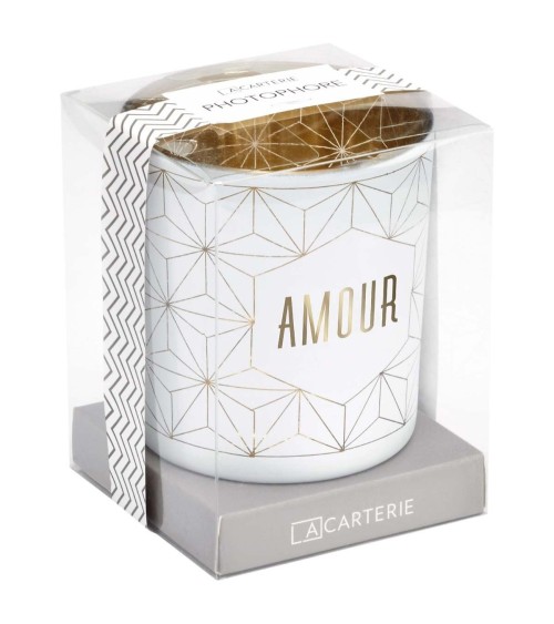 Amoureux ou amoureuse, ami ou amie, membre de votre famille, il n'est jamais trop tard pour déclarer votre flamme! De manière subtile et délicate, ce joli photophore en verre blanc et doré personnalisé 'Amour' rappellera vos sentiments au quotidien à la personne de votre choix. Cadeau instantané mais message sur la durée, osez cette touche attentionnée ! Ce photophore en verre a un diamètre de 7,5cm et une hauteur de 8cm.Détails du produitDimensions : H8xL7,5cmMatière : verreCouleur : Or et blanc