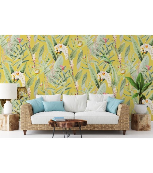 Papier peint panoramique motifs fleur jardin tropical canari 425x260cm