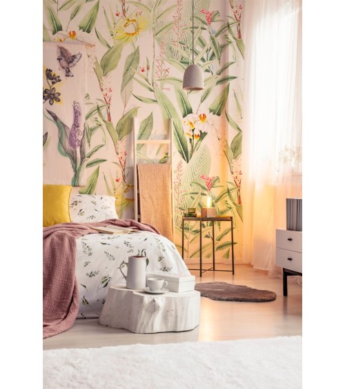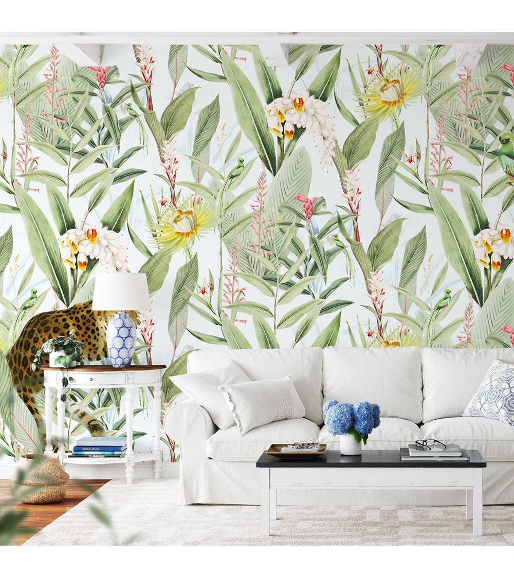 Papier peint panoramique motifs fleurs jardin tropical blanc 255x260cm