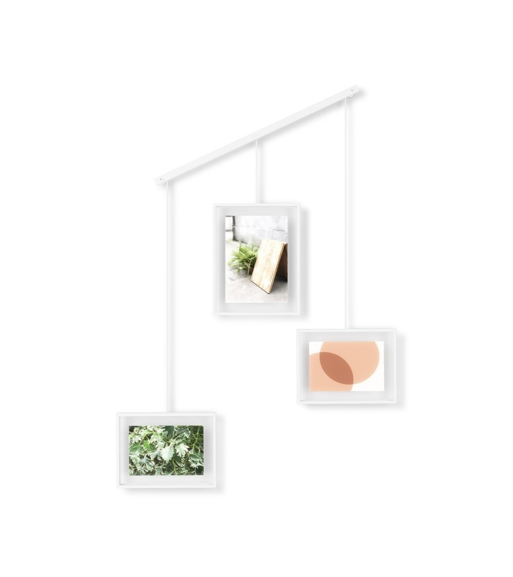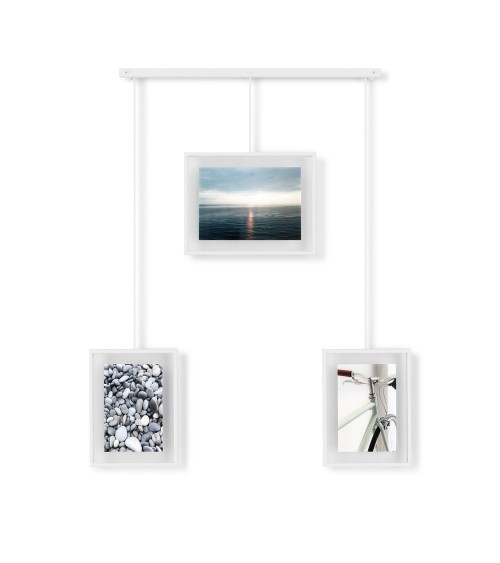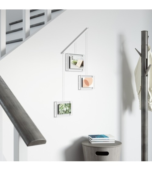 Présentez vos photos préférées dans une mise en scène attractive, de 3 cadres, façon galerie, pour deux photos 10x15cm et une photo 13x18cm. Chaque cadre peut être interchangé en déplaçant la tige sur la barre horizontale. La barre verticale peut elle-même être suspendue inclinée afin de suivre la pente d'un escalier ou d'une sous pente de toit. Vous pouvez même ajouter un 2ème Exhibit à la suite pour suivre toute la pente d'un escalier et avoir 6 photos présentées pour un effet encore plus impressionnant. De plus, Exhibit vous permet de ne visser que 2 vis dans votre mur pour 3 photos présentées. Dimensions totales : 67 x 46 x 3 cm Matière : métal