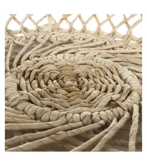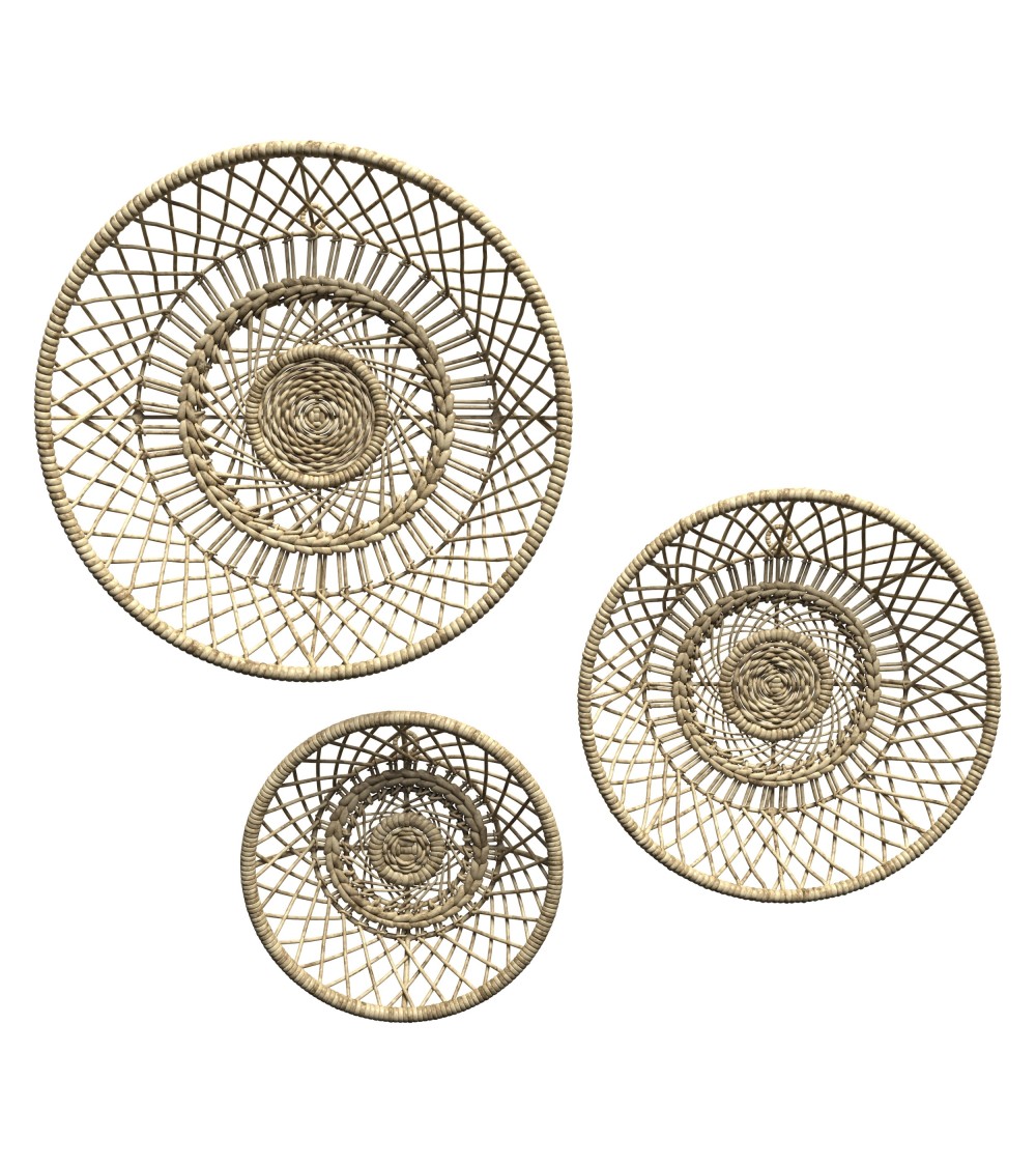 Poids : 1.8kg Dimensions: - Grande dimension :- Diamètre : 50 cm- Profondeur : 10 cm- - Moyenne dimension :- Diamètre : 40 cm- Profondeur : 8 cm- Petite dimension :- Diamètre : 31 cm- Profondeur : 7 cmEntretien : Nettoyer avec un chiffon doux imbibé d'un peu d'eau savonneuse. Rincer et sécher immédiatement. Pour dépoussiérer, utiliser la brosse d'un aspirateur. Materiaux : Fibre de bananierMontage : Livré montéInformations colis : 53 x 54 x 13 cm