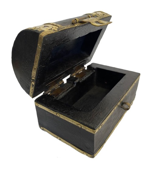 Boite en bois avec décoration en laiton ciselé Dimensions : Longueur 8.9 cm x Profondeur 5.4 cm x hauteur 5.5 cm Couvercle à charnières. Cette boite est un accessoire de rangement pratique qui n'en est pas moins un bel objet de décoration.