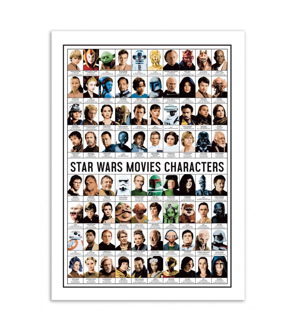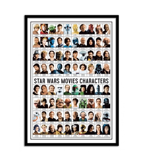 LES AFFICHES : Nos affiches sont imprimées en France, ou Union Européenne.Papier issu de forêts certifiées FSC.Affiche imprimée sur papier couché mat 250g, Haute Définition.Pour les formats d'affiches 30x40 cm : contient des marges blanches de 1,5 cm.Pour les formats d'affiches 50x70 cm : contient des marges blanches de 2 cm.OPTION CADRES : Nos cadres en bois sont fabriqués en France.Comprend une vitre en verre acrylique.Dimensions des cadres en bois 30x40 cm : Epaisseur du cadre : 15 mm, Profondeur du cadre : 20 mmDimensions des cadres en bois 50x70 cm : Epaisseur du cadre : 15 mm. Profondeur du cadre : 20 mm. Découvrez une mozaïque de 80 personnages inspirée de la saga Star Wars sur une seule affiche. Olivier Bourdereau retravaille ces héros cultes, comme Luke Skywalker, Dark Vador, Yoda, Leia, Han Solo et bien d'autres, dans une composition de type encyclopédique où l'on retrouve les informations importantes de nos personnages préférés. Convient parfaitement à tous les fans de Star Wars !