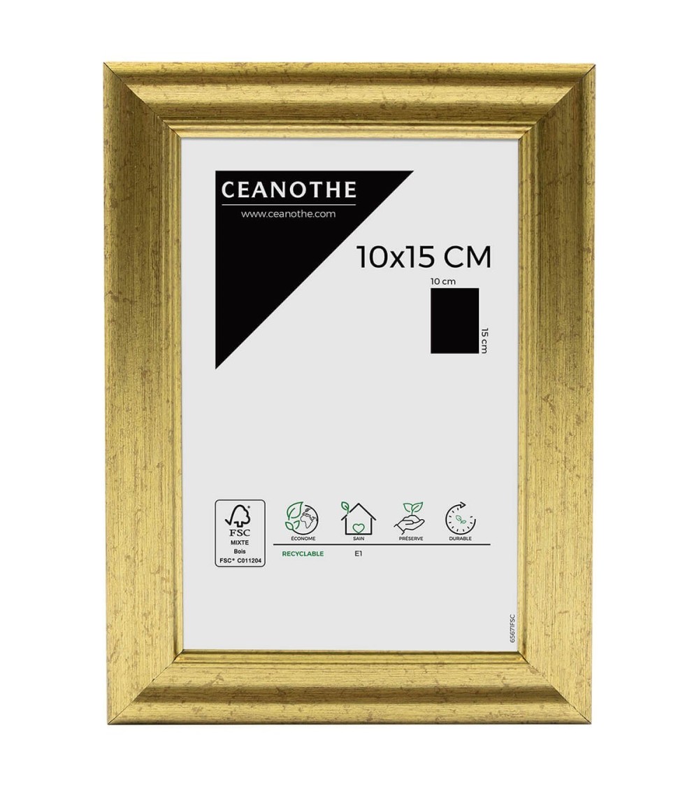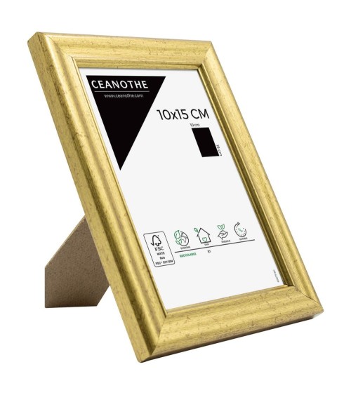 Protégez et mettez en avant toutes vos photos grâce au cadre Doré Circée et son verre minéral. Ce cadre photo format 10x15 cm est idéal pour mettre en avant des photos, posters ou affiches grand format de 10x15 cm. Ajoutez un passe-partout pour protéger et mettre en avant dautres formats de photos et posters avec ce cadre. La couleur Doré de ce cadre est simple et indémodable. Elle fait ressortir toutes vos plus belles uvres et photos tout en apportant une touche luxe et élégant à votre intérieur. Cadre Home déco facile à accrocher, il trouvera naturellement sa place dans toutes les pièces de la maison : hall dentrée, salon, chambres à coucher. Le cadre sublimera facilement un grand nombre de photos avec une touche déco classique et raffinée. Ce cadre photo Doré $15x10 cm est en résine recyclée, un matériau solide, nature et esthétique. Ses dimensions extérieures sont 18.3x13.2x1.8 cm et se compose de 4 baguettes travaillées. Il apportera de la profondeur à vos photos avec un rendu design très qualitatif. Les finitions de ce cadre sont soignées. La couleur de cette gamme Circée fait de ce cadre une valeur sûre que vous garderez longtemps. Fabriqués dans le respect de lenvironnement, tous les cadres de la collection Circée sont confectionnés en résine recyclée. Parfait pour la décoration, il est léger et 100% recyclable. Depuis 1975, Ceanothe perfectionne au quotidien son savoir-faire et expertise sur lencadrement, la mise en valeur photographique et la décoration murale. Une société française engagée dans une démarche éco-responsable.