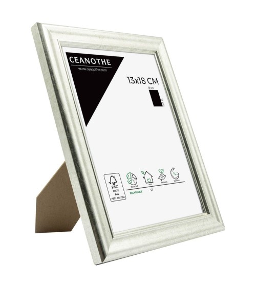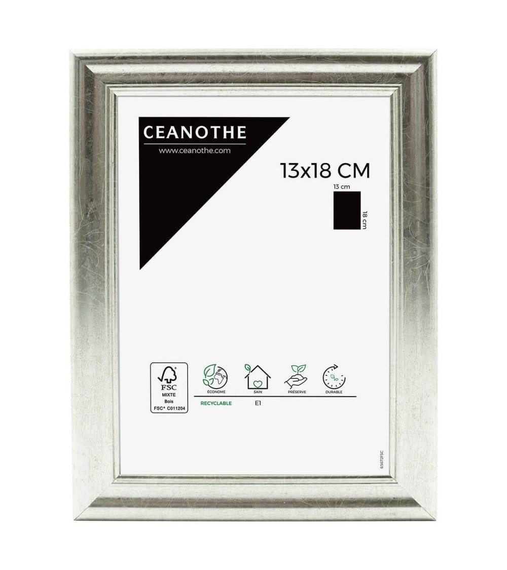 Protégez et mettez en avant toutes vos photos grâce au cadre Argent Circée et son verre minéral. Ce cadre photo format 13x18 cm est idéal pour mettre en avant des photos, posters ou affiches grand format de 13x18 cm. Ajoutez un passe-partout pour protéger et mettre en avant dautres formats de photos et posters avec ce cadre. La couleur Argent de ce cadre est simple et indémodable. Elle fait ressortir toutes vos plus belles uvres et photos tout en apportant une touche luxe et élégant à votre intérieur. Cadre Home déco facile à accrocher, il trouvera naturellement sa place dans toutes les pièces de la maison : hall dentrée, salon, chambres à coucher. Le cadre sublimera facilement un grand nombre de photos avec une touche déco classique et raffinée. Ce cadre photo Argent $18x13 cm est en résine recyclée, un matériau solide, nature et esthétique. Ses dimensions extérieures sont 22.2x16.2x1.8 cm et se compose de 4 baguettes travaillées. Il apportera de la profondeur à vos photos avec un rendu design très qualitatif. Les finitions de ce cadre sont soignées. La couleur de cette gamme Circée fait de ce cadre une valeur sûre que vous garderez longtemps. Fabriqués dans le respect de lenvironnement, tous les cadres de la collection Circée sont confectionnés en résine recyclée. Parfait pour la décoration, il est léger et 100% recyclable. Depuis 1975, Ceanothe perfectionne au quotidien son savoir-faire et expertise sur lencadrement, la mise en valeur photographique et la décoration murale. Une société française engagée dans une démarche éco-responsable.