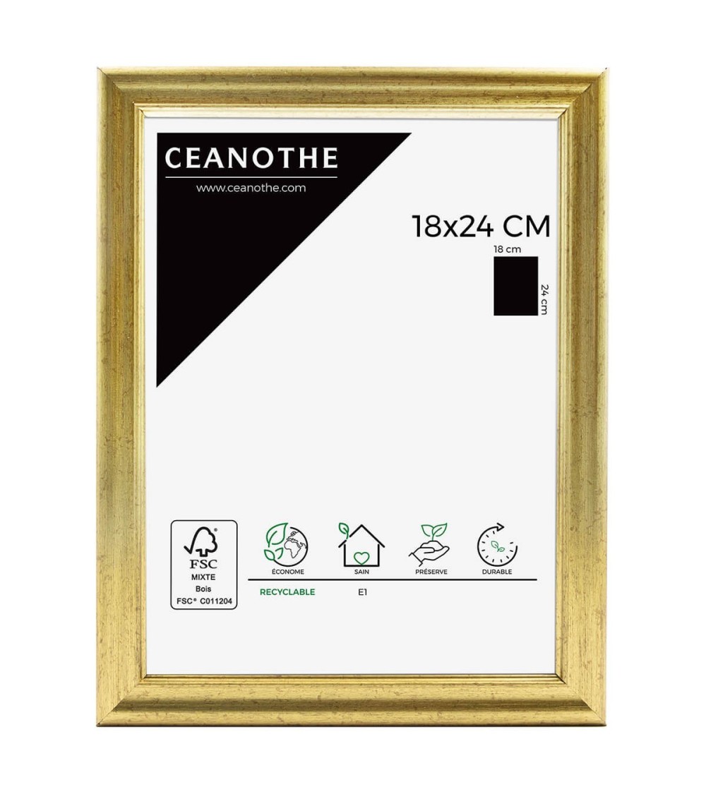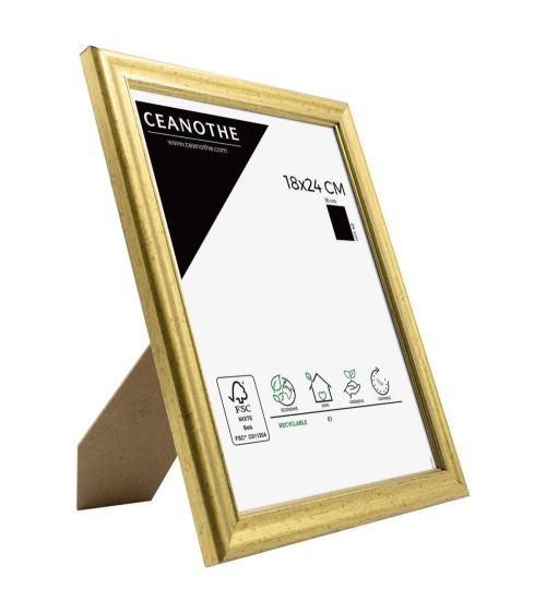 Protégez et mettez en avant toutes vos photos grâce au cadre Doré Circée et son verre minéral. Ce cadre photo format 18x24 cm est idéal pour mettre en avant des photos, posters ou affiches grand format de 18x24 cm. Ajoutez un passe-partout pour protéger et mettre en avant dautres formats de photos et posters avec ce cadre. La couleur Doré de ce cadre est simple et indémodable. Elle fait ressortir toutes vos plus belles uvres et photos tout en apportant une touche luxe et élégant à votre intérieur. Cadre Home déco facile à accrocher, il trouvera naturellement sa place dans toutes les pièces de la maison : hall dentrée, salon, chambres à coucher. Le cadre sublimera facilement un grand nombre de photos avec une touche déco classique et raffinée. Ce cadre photo Doré $24x18 cm est en résine recyclée, un matériau solide, nature et esthétique. Ses dimensions extérieures sont 27.2x21.2x1.8 cm et se compose de 4 baguettes travaillées. Il apportera de la profondeur à vos photos avec un rendu design très qualitatif. Les finitions de ce cadre sont soignées. La couleur de cette gamme Circée fait de ce cadre une valeur sûre que vous garderez longtemps. Fabriqués dans le respect de lenvironnement, tous les cadres de la collection Circée sont confectionnés en résine recyclée. Parfait pour la décoration, il est léger et 100% recyclable. Depuis 1975, Ceanothe perfectionne au quotidien son savoir-faire et expertise sur lencadrement, la mise en valeur photographique et la décoration murale. Une société française engagée dans une démarche éco-responsable.