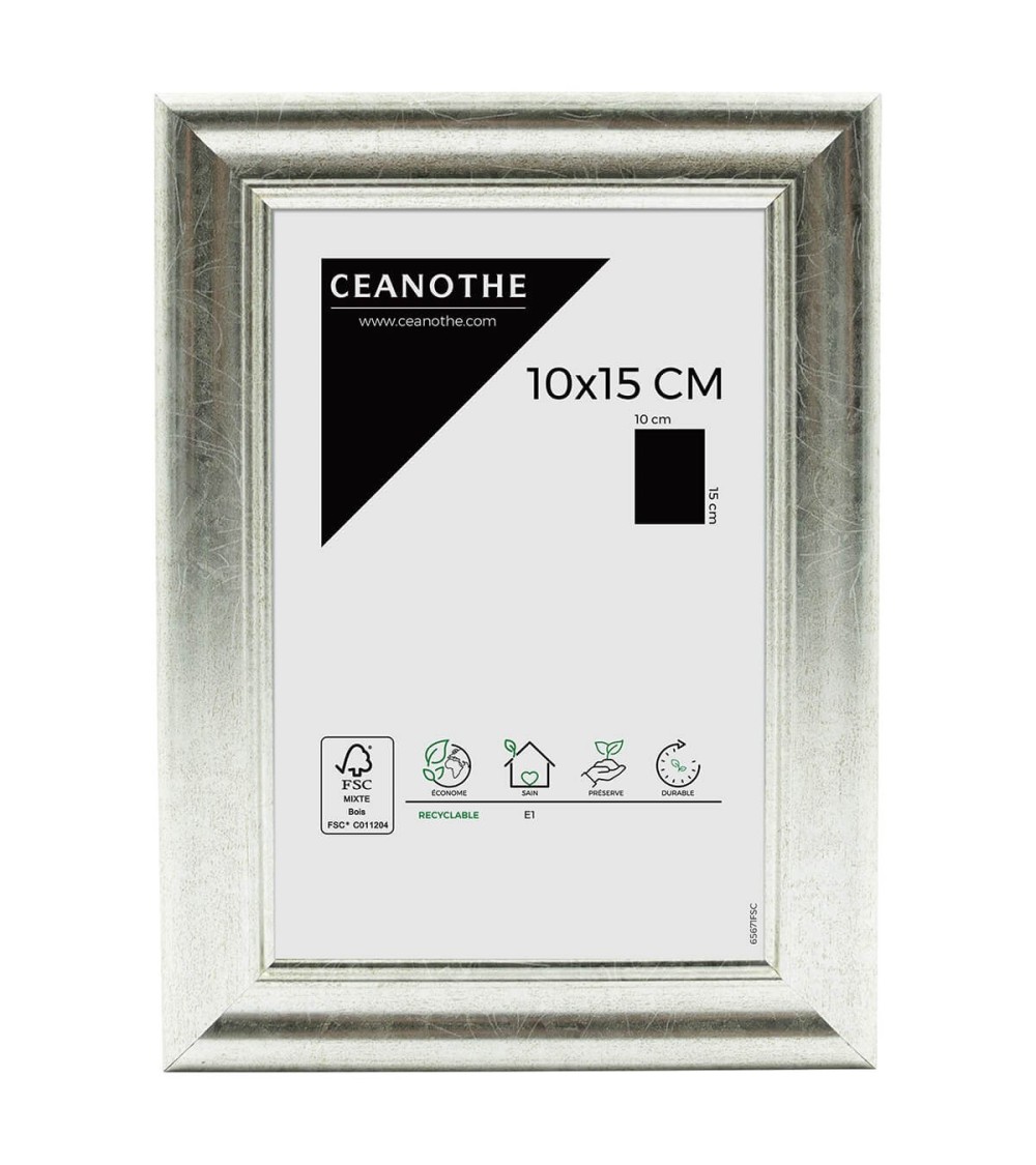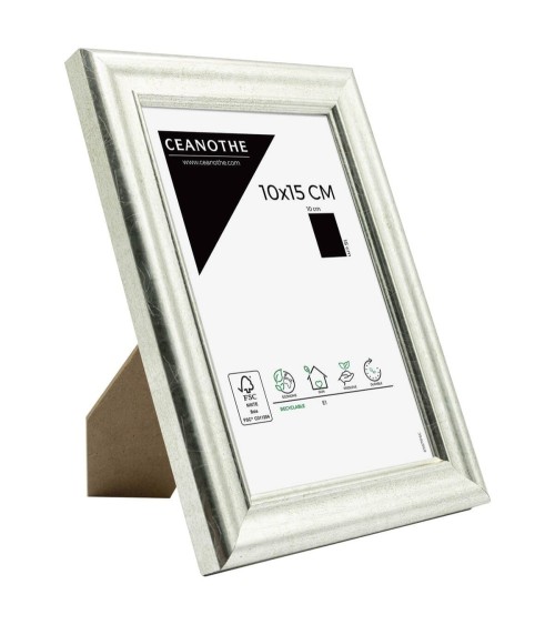 Protégez et mettez en avant toutes vos photos grâce au cadre Argent Circée et son verre minéral. Ce cadre photo format 10x15 cm est idéal pour mettre en avant des photos, posters ou affiches grand format de 10x15 cm. Ajoutez un passe-partout pour protéger et mettre en avant dautres formats de photos et posters avec ce cadre. La couleur Argent de ce cadre est simple et indémodable. Elle fait ressortir toutes vos plus belles uvres et photos tout en apportant une touche luxe et élégant à votre intérieur. Cadre Home déco facile à accrocher, il trouvera naturellement sa place dans toutes les pièces de la maison : hall dentrée, salon, chambres à coucher. Le cadre sublimera facilement un grand nombre de photos avec une touche déco classique et raffinée. Ce cadre photo Argent $15x10 cm est en résine recyclée, un matériau solide, nature et esthétique. Ses dimensions extérieures sont 18.3x13.2x1.8 cm et se compose de 4 baguettes travaillées. Il apportera de la profondeur à vos photos avec un rendu design très qualitatif. Les finitions de ce cadre sont soignées. La couleur de cette gamme Circée fait de ce cadre une valeur sûre que vous garderez longtemps. Fabriqués dans le respect de lenvironnement, tous les cadres de la collection Circée sont confectionnés en résine recyclée. Parfait pour la décoration, il est léger et 100% recyclable. Depuis 1975, Ceanothe perfectionne au quotidien son savoir-faire et expertise sur lencadrement, la mise en valeur photographique et la décoration murale. Une société française engagée dans une démarche éco-responsable.