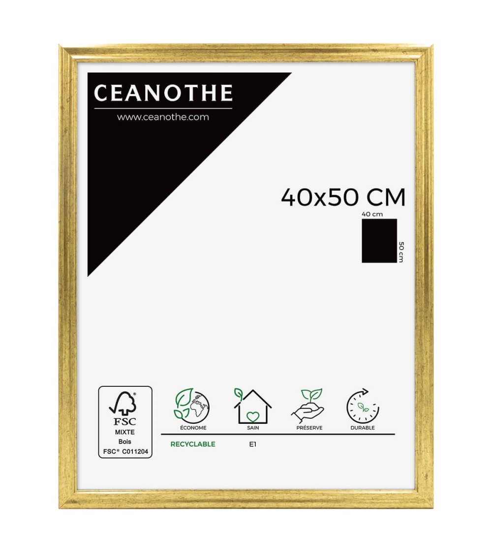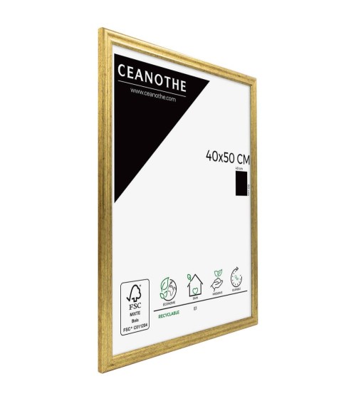 Protégez et mettez en avant toutes vos photos grâce au cadre Doré Circée et son verre minéral. Ce cadre photo format 40x50 cm est idéal pour mettre en avant des photos, posters ou affiches grand format de 40x50 cm. Ajoutez un passe-partout pour protéger et mettre en avant dautres formats de photos et posters avec ce cadre. La couleur Doré de ce cadre est simple et indémodable. Elle fait ressortir toutes vos plus belles uvres et photos tout en apportant une touche luxe et élégant à votre intérieur. Cadre Home déco facile à accrocher, il trouvera naturellement sa place dans toutes les pièces de la maison : hall dentrée, salon, chambres à coucher. Le cadre sublimera facilement un grand nombre de photos avec une touche déco classique et raffinée. Ce cadre photo Doré $50x40 cm est en résine recyclée, un matériau solide, nature et esthétique. Ses dimensions extérieures sont 53.7x43.5x2.1 cm et se compose de 4 baguettes travaillées. Il apportera de la profondeur à vos photos avec un rendu design très qualitatif. Les finitions de ce cadre sont soignées. La couleur de cette gamme Circée fait de ce cadre une valeur sûre que vous garderez longtemps. Fabriqués dans le respect de lenvironnement, tous les cadres de la collection Circée sont confectionnés en résine recyclée. Parfait pour la décoration, il est léger et 100% recyclable. Depuis 1975, Ceanothe perfectionne au quotidien son savoir-faire et expertise sur lencadrement, la mise en valeur photographique et la décoration murale. Une société française engagée dans une démarche éco-responsable.