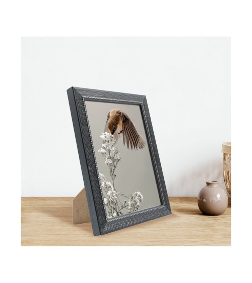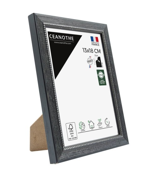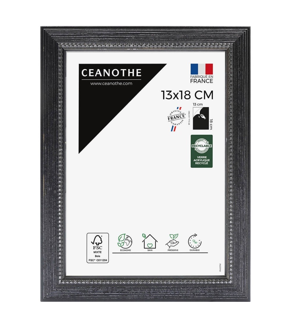 Protégez et mettez en avant toutes vos photos grâce au cadre Noir Perle et son verre acrylique recyclé. Ce cadre photo format 13x18 cm est idéal pour mettre en avant des photos, posters ou affiches grand format de 13x18 cm. Ajoutez un passe-partout pour protéger et mettre en avant dautres formats de photos et posters avec ce cadre.La couleur Noir avec finition patinée de ce cadre est chic et plein de charme. Elle fait ressortir toutes vos plus belles uvres et photos tout en apportant un effet romantique haut de gamme à votre intérieur. Cadre Home deco facile à accrocher, il trouvera naturellement sa place dans toutes les pièces de la maison : hall dentrée, salon, chambres à coucher. Le cadre sublimera facilement un grand nombre de photos avec une touche déco très tendance. Ce cadre photo bois 13x18 cm est en bois massif naturel, un matériau solide, naturel et esthétique. Ses dimensions extérieures sont 210x160x20 mm et se compose de 4 baguettes travaillées et de qualité. Il apportera de la profondeur à vos photos avec un rendu design très qualitatif. Les finitions de ce cadre sont soignées. La couleur de cette gamme Perle fait de ce cadre une valeur sûre que vous garderez longtemps. Fabriqués en France et dans le respect de lenvironnement, tous les cadres de la collection Perle sont confectionnés en bois massif certifié FSC. Parfait pour la décoration, il est léger et 100% recyclable. Depuis 1975, Ceanothe perfectionne au quotidien son savoir-faire et expertise sur lencadrement, la mise en valeur photographique et la décoration murale. Une société française engagée dans une démarche éco-responsable.