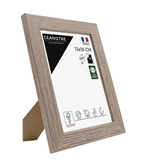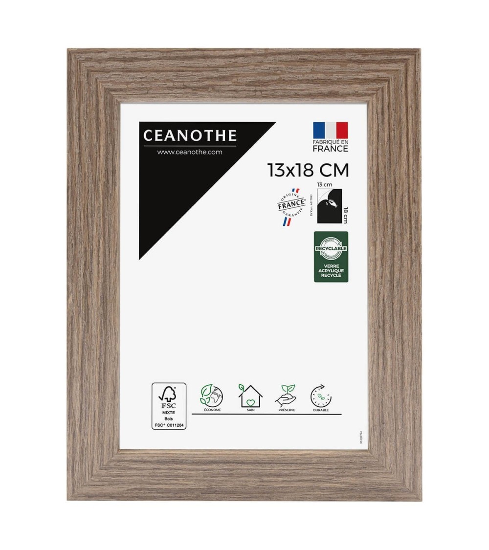 Protégez et mettez en avant toutes vos photos grâce au cadre bois Nordique et son verre acrylique recyclé. Ce cadre photo format 13x18 cm est idéal pour mettre en avant des photos, posters ou affiches grand format de 13x18 cm. Ajoutez un passe-partout pour protéger et mettre en avant dautres formats de photos et posters avec ce cadre.La couleur Marron de ce cadre est naturel et authentique. Elle fait ressortir toutes vos plus belles uvres et photos tout en apportant un effet naturel haut de gamme à votre intérieur. Cadre Home déco facile à accrocher, il trouvera naturellement sa place dans toutes les pièces de la maison : hall dentrée, salon, chambres à coucher. Le cadre sublimera facilement un grand nombre de photos avec une touche déco très tendance. Ce cadre photo bois 13x18 cm est en bois reconstitué naturel, un matériau solide, naturel et esthétique. Ses dimensions extérieures sont 230x170x15 mm et se compose de 4 baguettes fines travaillées et de qualité. Il apportera de la profondeur à vos photos avec un rendu tendance très qualitatif. Les finitions de ce cadre sont soignées. La couleur de cette gamme Nordique fait de ce cadre une valeur sûre que vous garderez longtemps.Fabriqués en France dans le respect de lenvironnement, tous les cadres de la collection Nordique sont confectionnés à partir de bois reconstitué certifié FSC. Parfait pour la décoration, il est léger et 100% recyclable.Depuis 1975, Ceanothe perfectionne au quotidien son savoir-faire et expertise sur lencadrement, la mise en valeur photographique et la décoration murale. Une société française engagée dans une démarche éco-responsable.