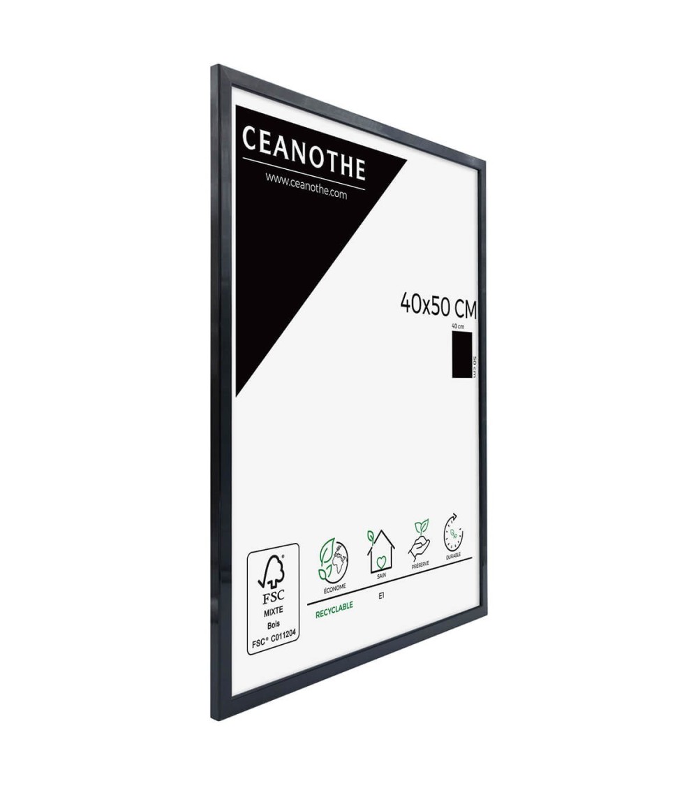 Protégez et mettez en avant toutes vos photos grâce au cadre Noir River et son verre minéral. Ce cadre photo format 40x50 cm est idéal pour mettre en avant des photos, posters ou affiches grand format de 40x50 cm. Ajoutez un passe-partout pour protéger et mettre en avant dautres formats de photos et posters avec ce cadre.La couleur Noir avec finition laquée légèrement brillant de ce cadre est moderne et indémodable. Elle fait ressortir toutes vos plus belles uvres et photos tout en apportant un effet urbain à votre intérieur. Cadre Home déco facile à accrocher, il trouvera naturellement sa place dans toutes les pièces de la maison : hall dentrée, salon, chambres à coucher. Le cadre sublimera facilement un grand nombre de photos avec une touche déco très tendance. Ce cadre photo 40x50 cm est en résine recyclée, un matériau solide et esthétique. Ses dimensions extérieures sont 525x425x14 mm et se compose de 4 baguettes finition laquée et de qualité. Il apportera de la profondeur à vos photos avec un rendu design très qualitatif. Les finitions de ce cadre sont soignées. La couleur de cette gamme River fait de ce cadre une valeur sûre que vous garderez longtemps. Fabriqués en France dans le respect de lenvironnement, tous les cadres de la collection River sont confectionnés à partir de bois reconstitué certifié FSC. Parfait pour la décoration, il est léger et 100% recyclable. Depuis 1975, Ceanothe perfectionne au quotidien son savoir-faire et expertise sur lencadrement, la mise en valeur photographique et la décoration murale. Une société française engagée dans une démarche éco-responsable.