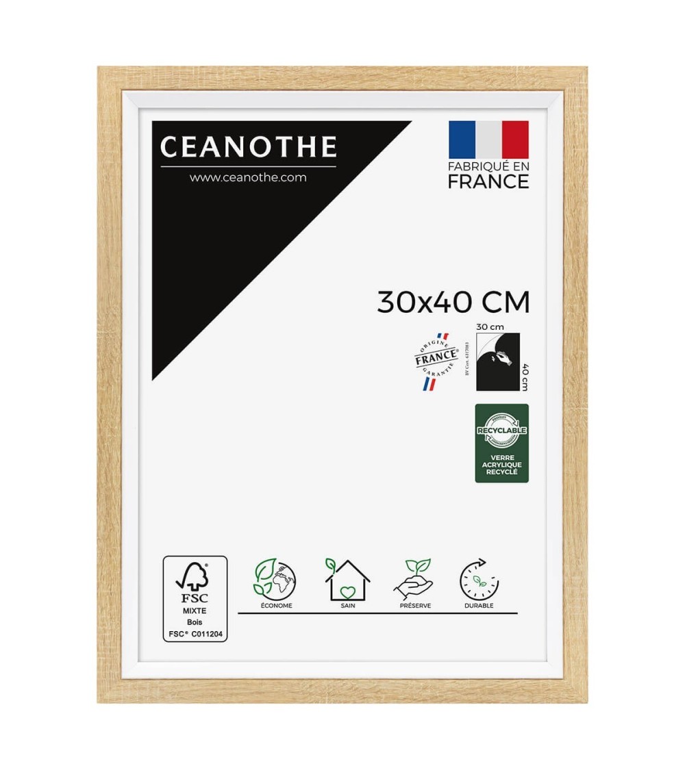 Protégez et mettez en avant toutes vos photos grâce au cadre Brut Actual et son verre acrylique recyclé. Ce cadre photo format 30x40 cm est idéal pour mettre en avant des photos, posters ou affiches grand format de 30x40 cm. Ajoutez un passe-partout pour protéger et mettre en avant dautres formats de photos et posters avec ce cadre.La couleur Brut et Blanc de ce cadre est tendance et indémodable. Elle fait ressortir toutes vos plus belles uvres et photos tout en apportant une touche luxe et élégant à votre intérieur. Cadre Home déco facile à accrocher, il trouvera naturellement sa place dans toutes les pièces de la maison : hall dentrée, salon, chambres à coucher. Le cadre sublimera facilement un grand nombre de photos avec une touche déco très tendance, tout en raffinement.Ce cadre photo Brut Blanc 30x40 cm est en résine recyclée, un matériau solide, nature et esthétique. Ses dimensions extérieures sont 447x347x16 mm et se compose de 4 baguettes travaillées avec une finition de qualité. Il apportera de la profondeur à vos photos avec un rendu design très qualitatif. Les finitions de ce cadre sont soignées. La couleur de cette gamme Actual fait de ce cadre une valeur sûre que vous garderez longtemps.Fabriqués en France et dans le respect de lenvironnement, tous les cadres de la collection Actual sont confectionnés en résine recyclée. Parfait pour la décoration, il est léger et 100% recyclable.Depuis 1975, Ceanothe perfectionne au quotidien son savoir-faire et expertise sur lencadrement, la mise en valeur photographique et la décoration murale. Une société française engagée dans une démarche éco-responsable.