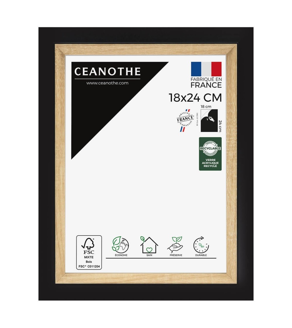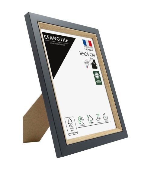 Protégez et mettez en avant toutes vos photos grâce au cadre Noir Actual et son verre acrylique recyclé. Ce cadre photo format 18x24 cm est idéal pour mettre en avant des photos, posters ou affiches grand format de 18x24 cm. Ajoutez un passe-partout pour protéger et mettre en avant dautres formats de photos et posters avec ce cadre.La couleur Noir et Bois de ce cadre est tendance et indémodable. Elle fait ressortir toutes vos plus belles uvres et photos tout en apportant une touche luxe et élégant à votre intérieur. Cadre Home déco facile à accrocher, il trouvera naturellement sa place dans toutes les pièces de la maison : hall dentrée, salon, chambres à coucher. Le cadre sublimera facilement un grand nombre de photos avec une touche déco très tendance, tout en raffinement.Ce cadre photo Noir Bois 18x24 cm est en résine recyclée, un matériau solide, nature et esthétique. Ses dimensions extérieures sont 287x227x19 mm et se compose de 4 baguettes travaillées avec une finition de qualité. Il apportera de la profondeur à vos photos avec un rendu design très qualitatif. Les finitions de ce cadre sont soignées. La couleur de cette gamme Actual fait de ce cadre une valeur sûre que vous garderez longtemps.Fabriqués en France et dans le respect de lenvironnement, tous les cadres de la collection Actual sont confectionnés en résine recyclée. Parfait pour la décoration, il est léger et 100% recyclable.Depuis 1975, Ceanothe perfectionne au quotidien son savoir-faire et expertise sur lencadrement, la mise en valeur photographique et la décoration murale. Une société française engagée dans une démarche éco-responsable.